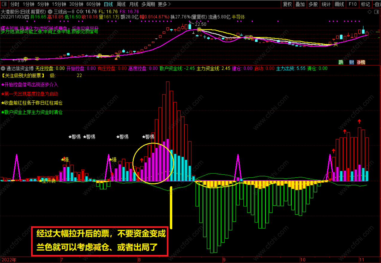 经过大幅拉升后的票,博弈资金变成兰色就可以考虑减仓、或者出局了。