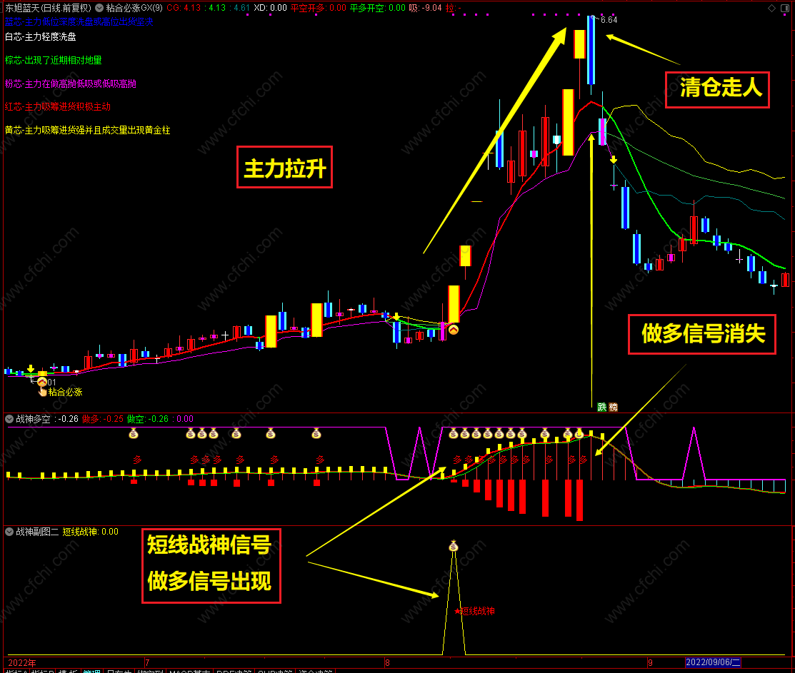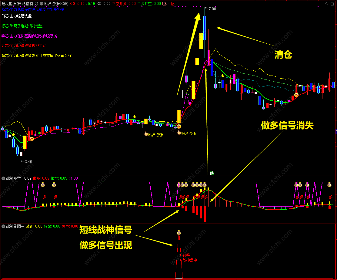 本套指标副图:【战神多空】信号非常有特色,选股股票后,根据多空信号操盘,信号消失,立即走人,避免被套。