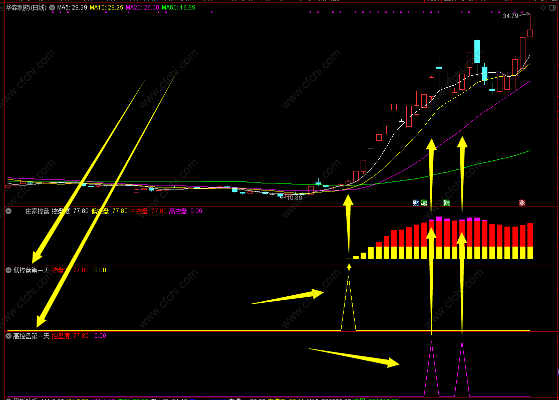 指标包含:3个副图指标+2个选股指标(独创高控盘第一天、低控盘第一天)