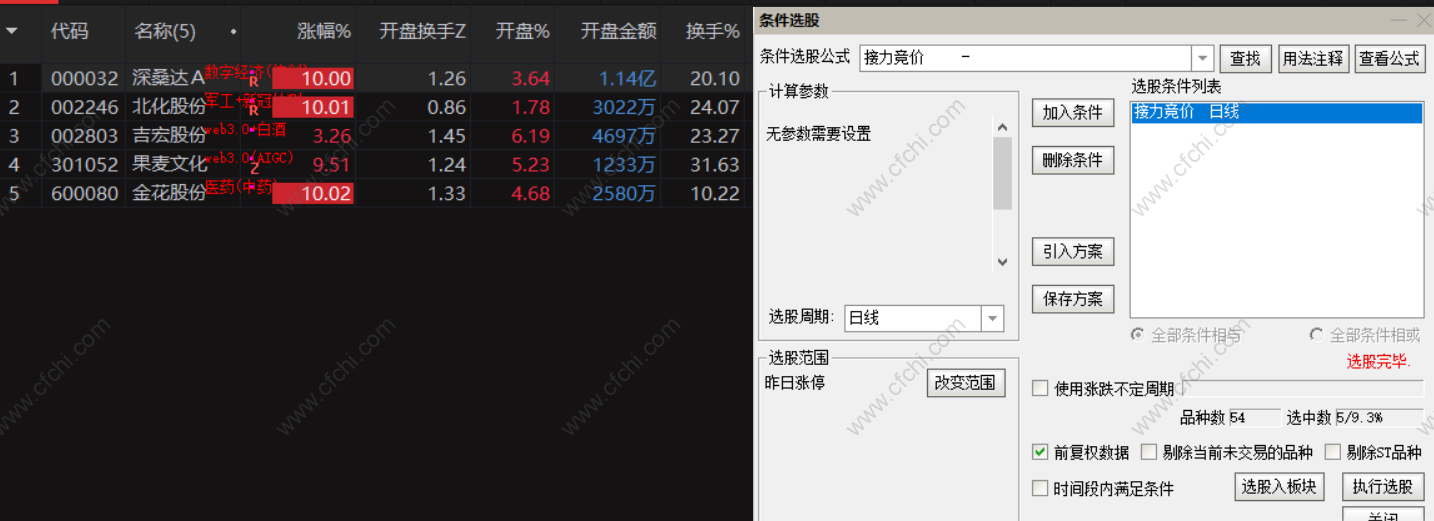 选股时间9:25-9点29分 有开盘价,但还未正式开始交 易的时间段选股。
