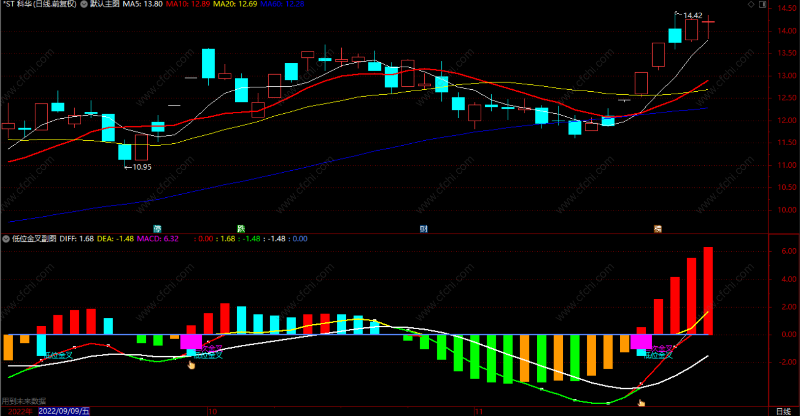 DRAWTEXT(低位金叉,-1.5,' 低位金叉'),COLORFFFF00;
