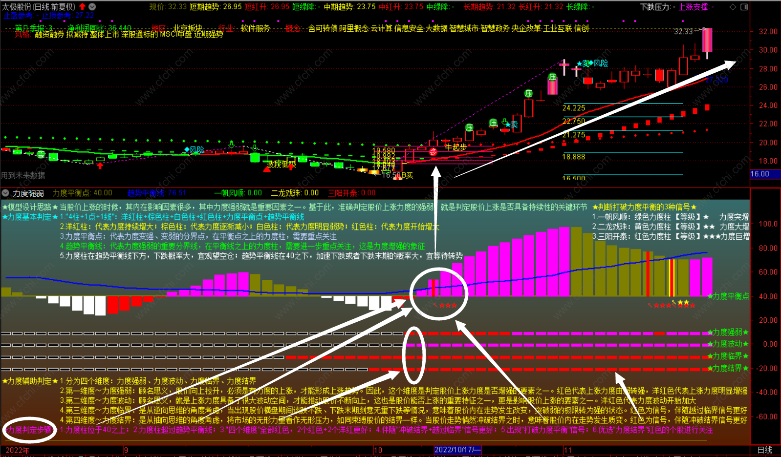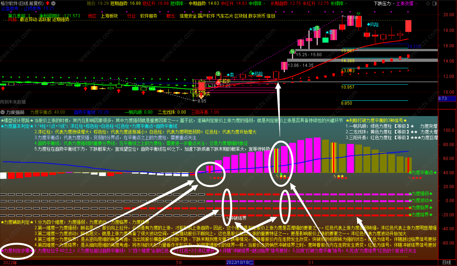 第二,判定力度强弱的基本标准,是“4柱+1点+1线”。