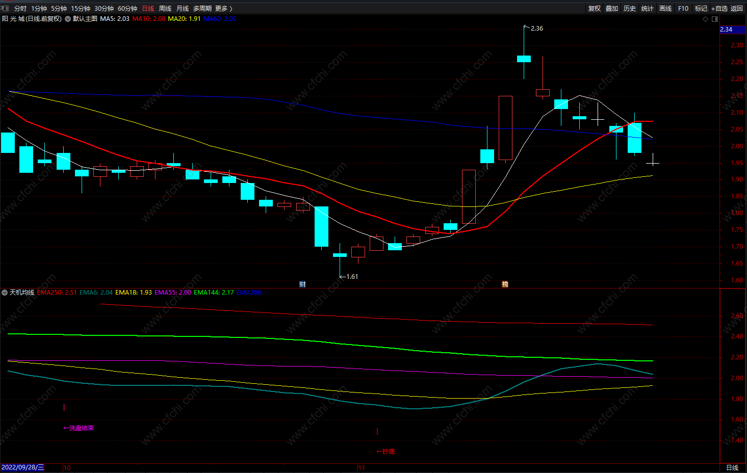 DRAWTEXT(T,LOW-0.4,'←洗盘结束'),COLORFF00FF;