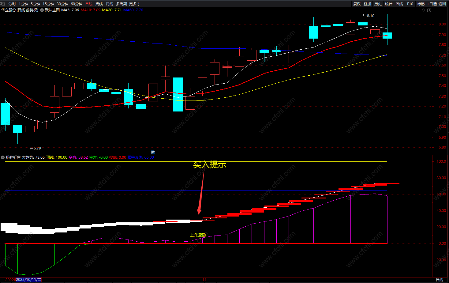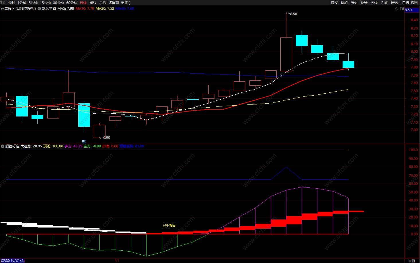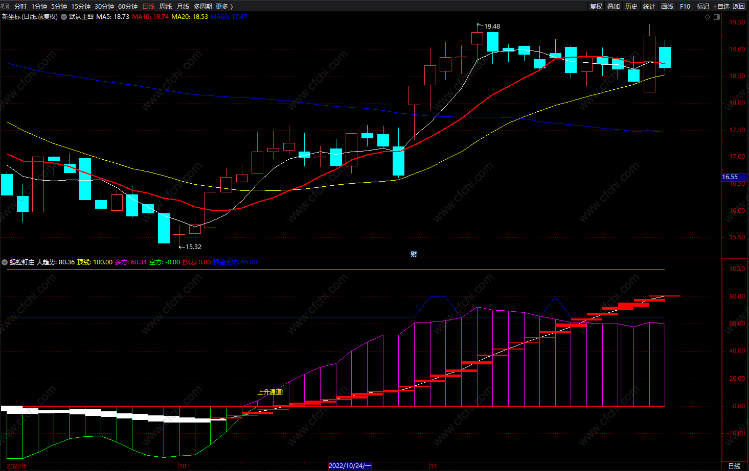大趋势多空提示副图“上升通道“红色波段上涨;