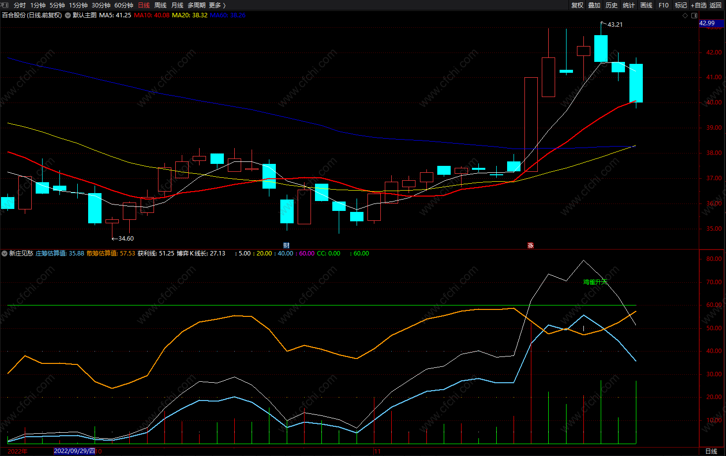 BB:=CROSS(28,庄筹线) AND 散筹线>40 AND AA=1 AND LLV(L ,60 )>LLV(L ,250 );