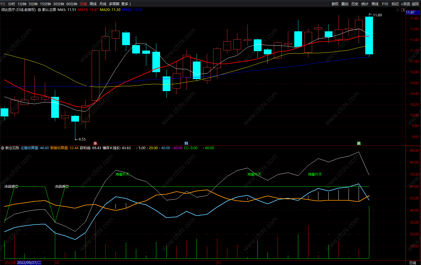 散筹线:=EMA((WINNER(C*1.1)-WINNER(C*0.9))*70,5),COLORYELLOW,LINETHICK2;