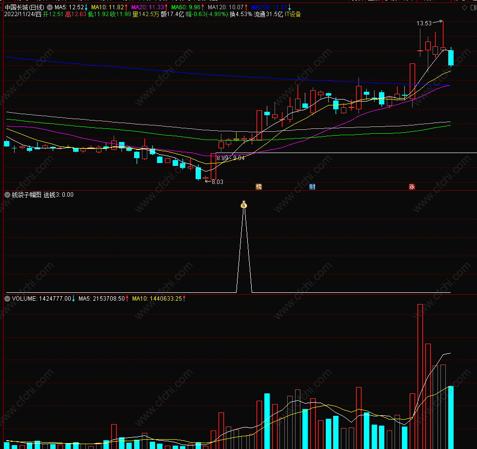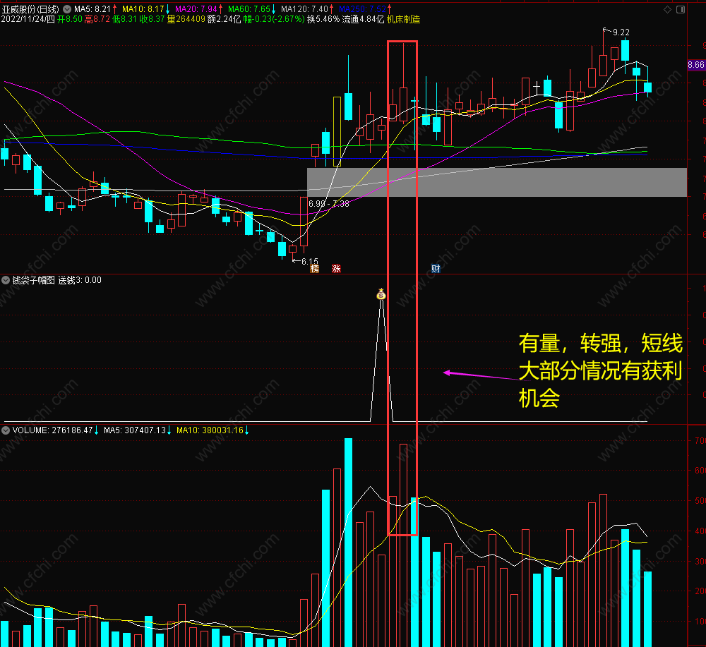2、钱袋子选股信号为一个三角形信号,带有钱袋子,故名钱袋子选股,如下图