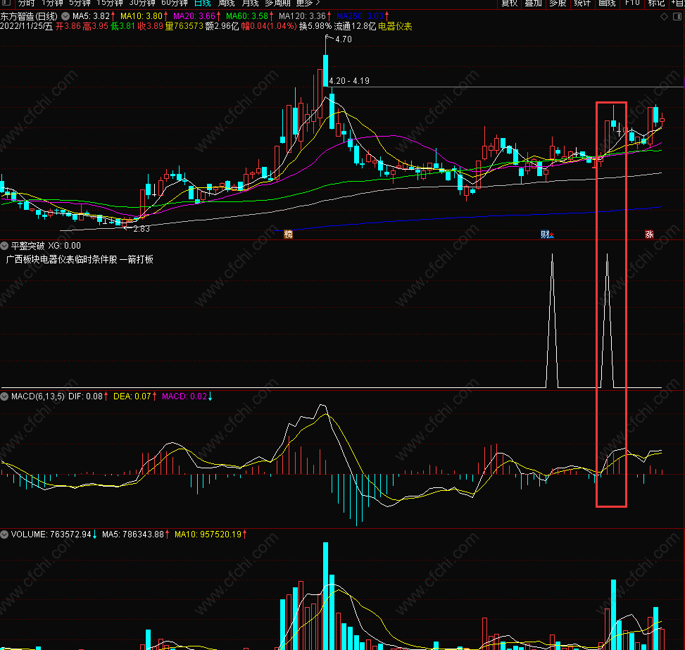 2、平整突破指标用法分享:成交量够大,并且不能跌破信号当天的阳线,不然失败,可能导致破位