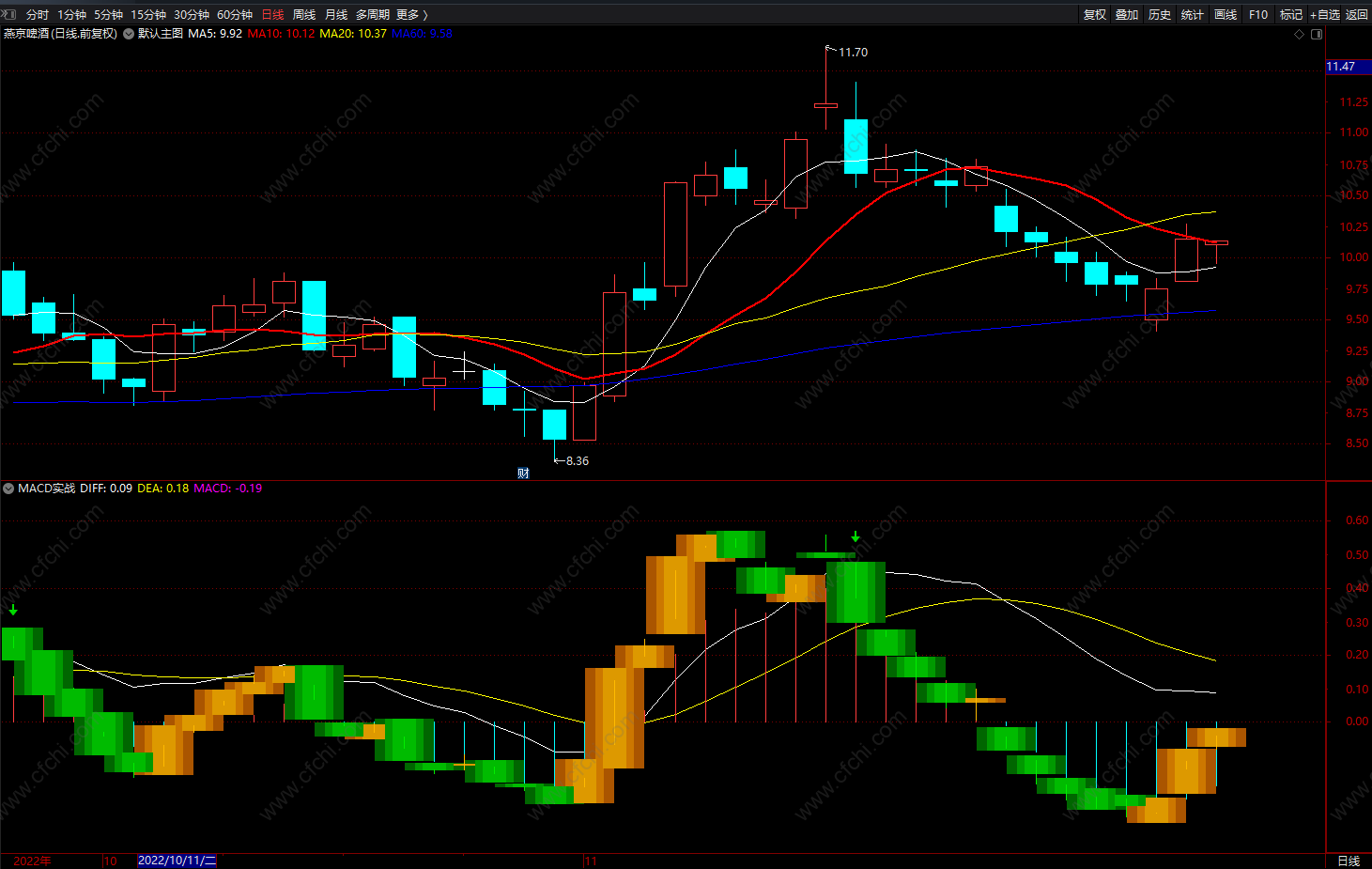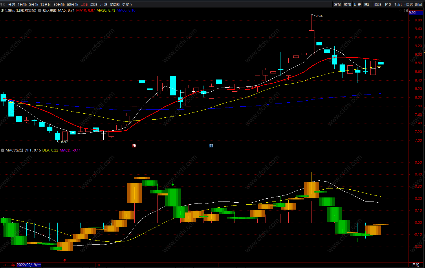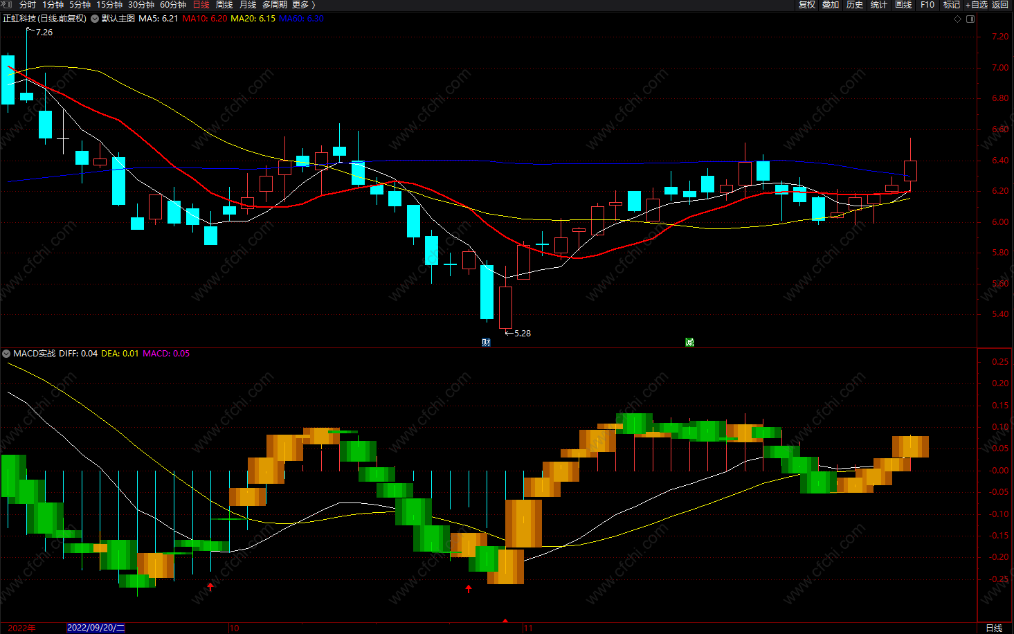 MACD实战指标,红色箭头信号可关注,橙色柱为上涨趋势,白线上穿持股区;绿柱下跌趋势,绿色箭头卖出!
