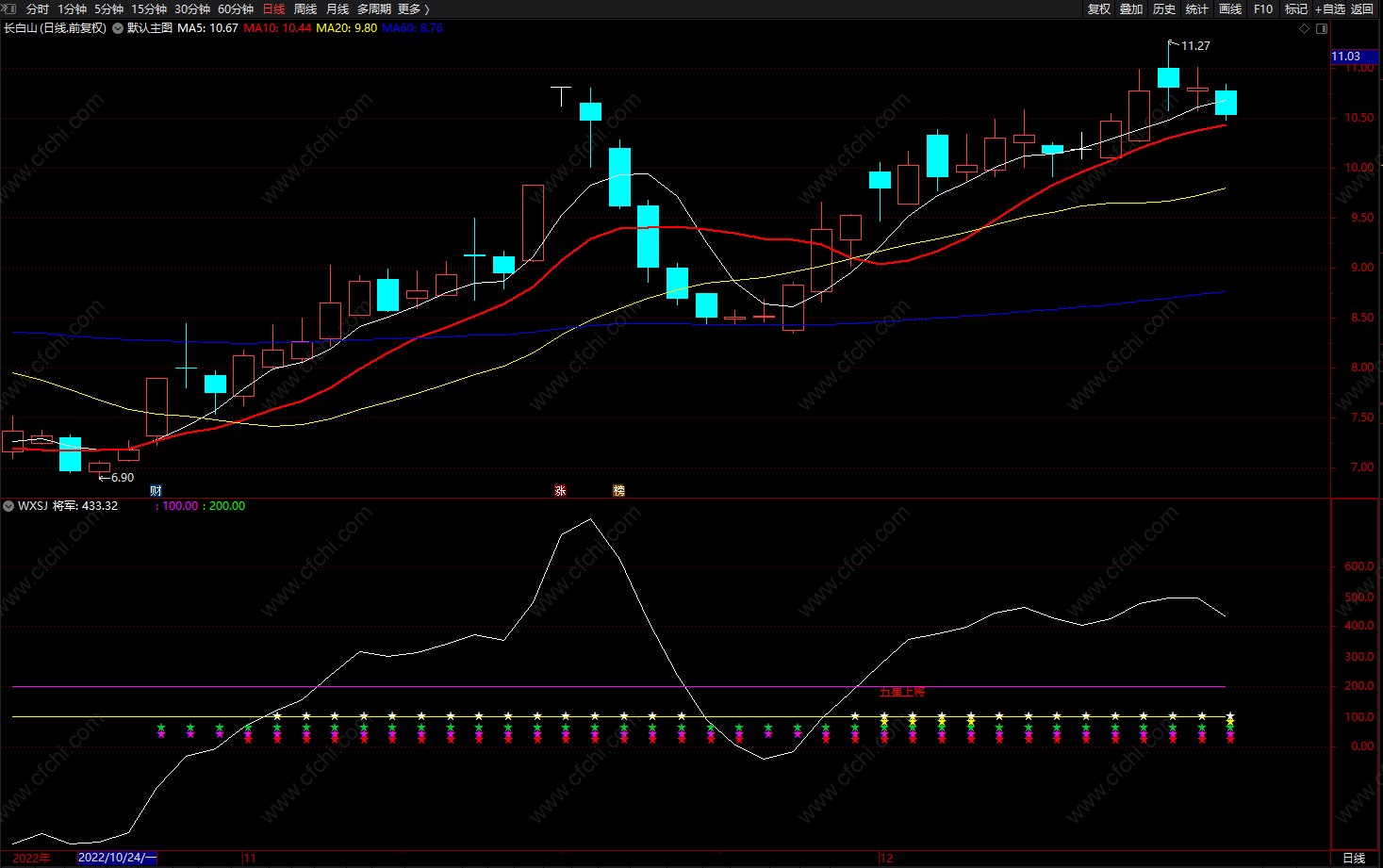 五星上将 玫红色线上持股 白线下穿玫红色线 卖出趋势!
