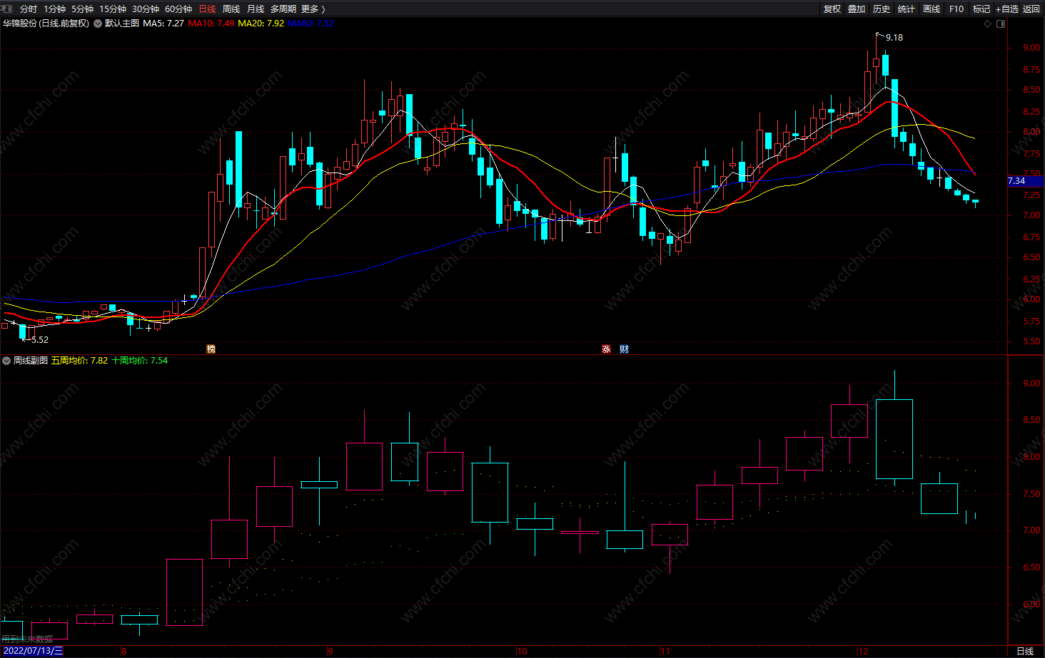 五周均价:(REF(CLOSE,5-(5-WEEKDAY))+REF(CLOSE,10-(5-WEEKDAY))