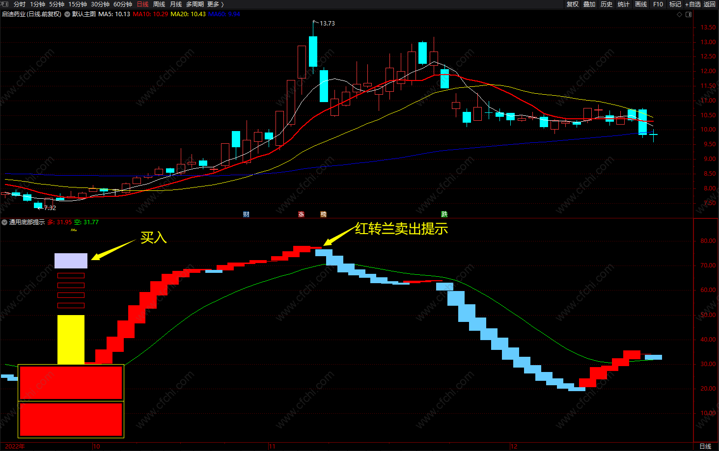 指标底部发出抄底信号,擒涨停指标;文字信号提示'底' 红色区域上涨 红转兰下跌趋势!