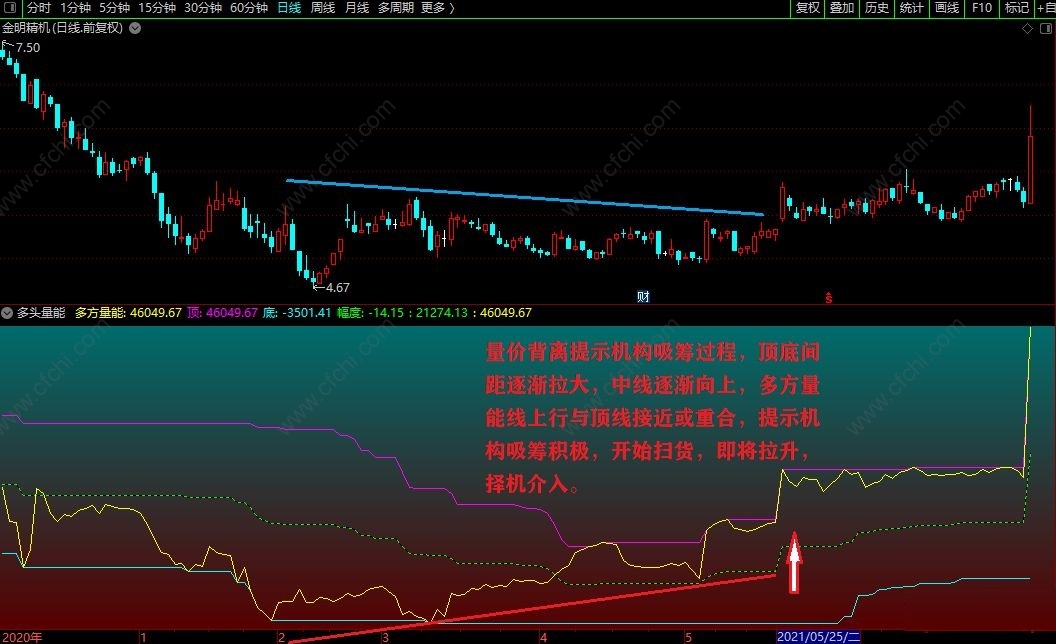 当股价横盘整理一段时间后,顶底间距由很窄通道走平逐渐向上移,多方量能线上穿中线(绿色虚线)接近顶线或与顶线重合,表明机构吸筹迫不及待,扫货意愿强烈,随时展开拉升行情。如有前述重点关注情形出现,择机果断介入。也许一匹大黑马就被你骑上了!