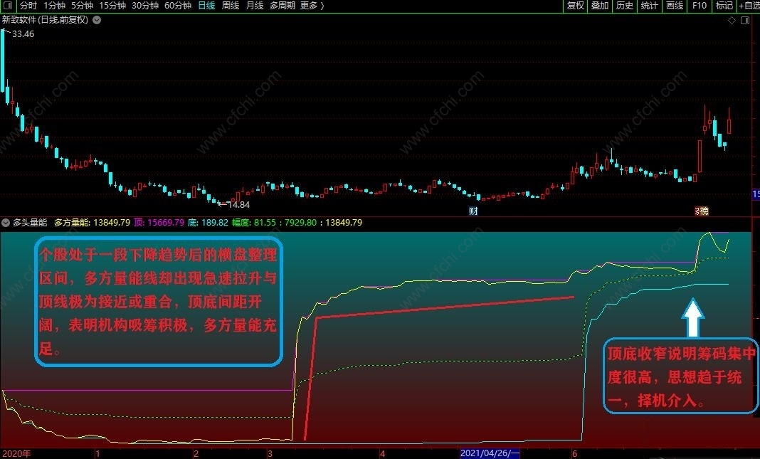 个股处于下降趋势中,多头量能指标中顶底间距由大变小,顶底通道收窄走平是有主力机构吸筹的开始。如在股价下跌过程中多方量能线走平或上行,表明主力机构吸筹愿望积极,重点关注!当股价进入横盘整理区间时,如多方量能线逐渐上行甚至急速上行,也表明主力机构吸筹愿望积极,重点关注!