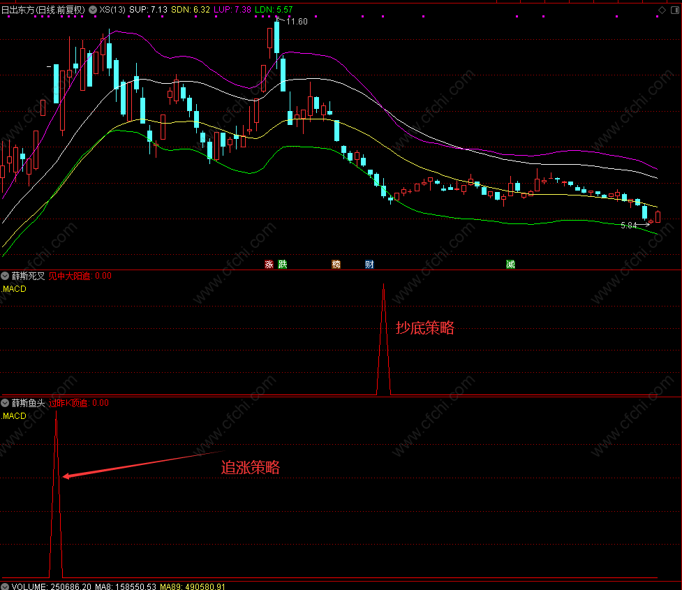 分别是:薛斯通道死叉幅图、选股指标;以及薛斯鱼头幅图,选股指标。对应的操作为:抄底(反弹),追涨策略。