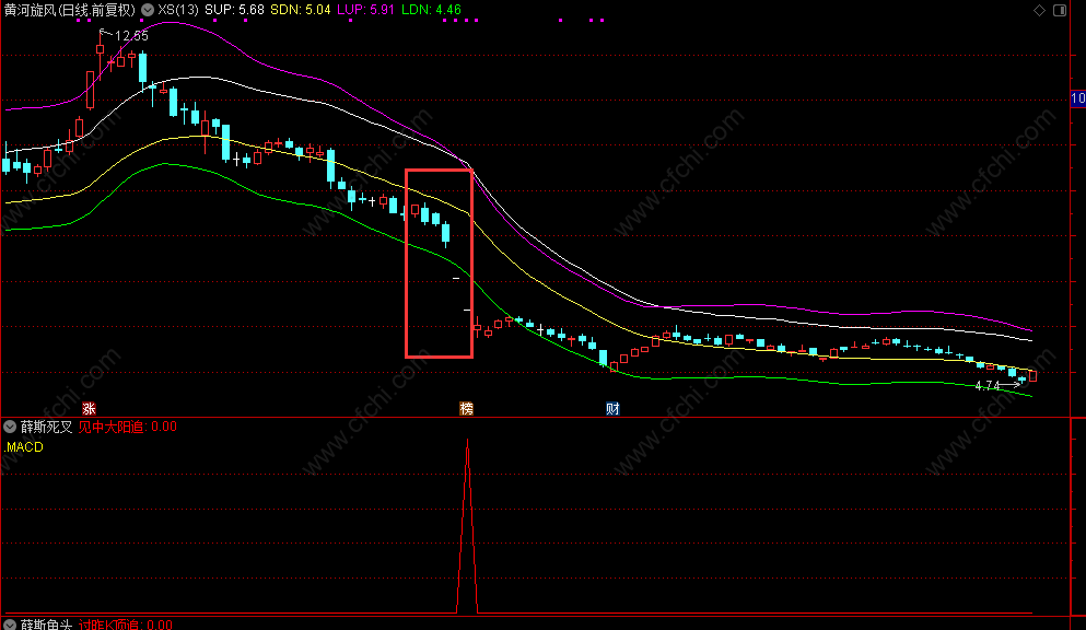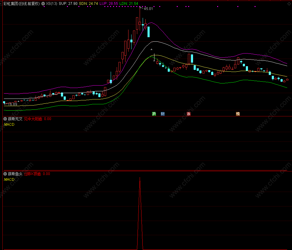 进行选股,以薛斯死叉幅图指标为案例,选出股票后,由于是抄底指标,大部分股票还在下跌,此时,我们打开主图薛斯通道主图: