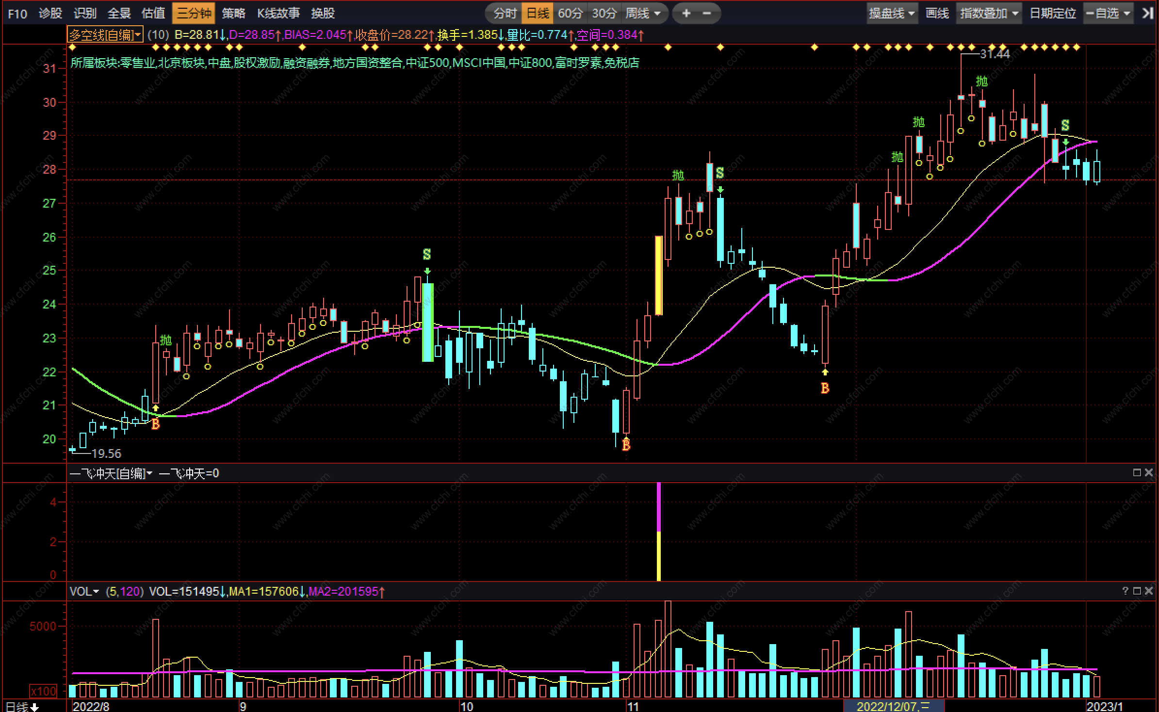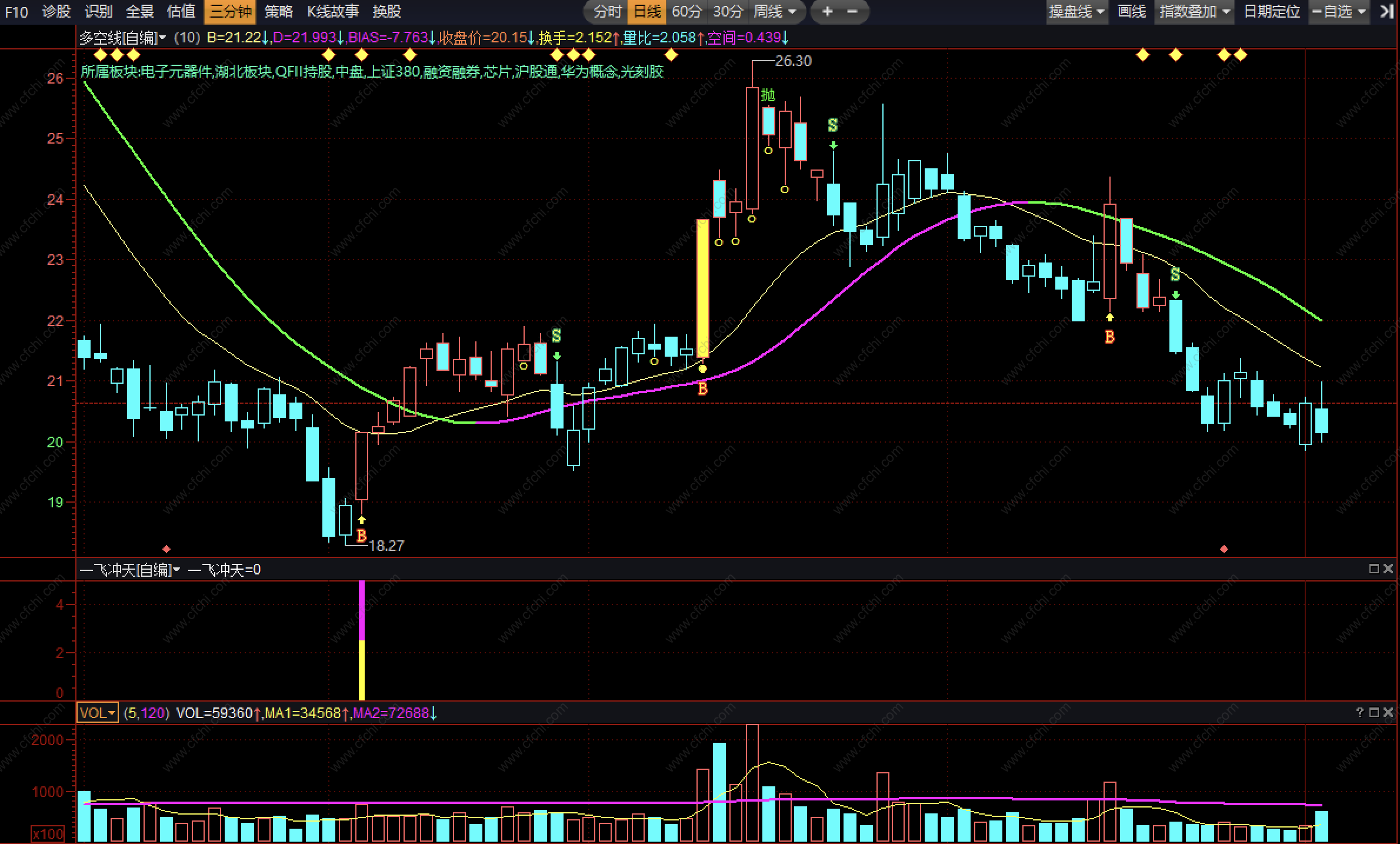 (【益盟操盘手】一飞冲天副图指标,捕获阶段低位票,益盟版指标源码分享!)
