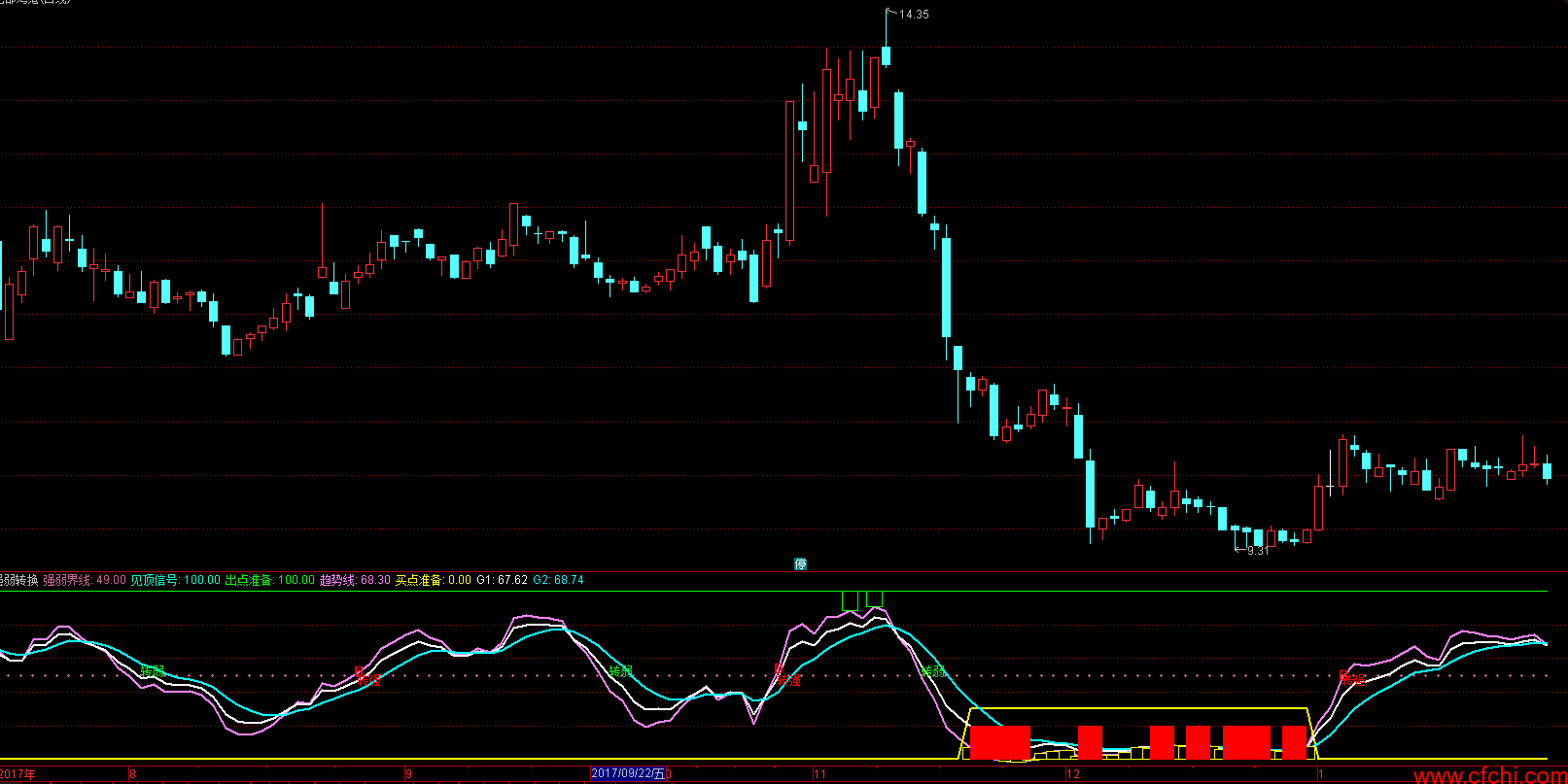 DRAWTEXT(CROSS(49,趋势线),52,'转弱'),COLORGREEN;