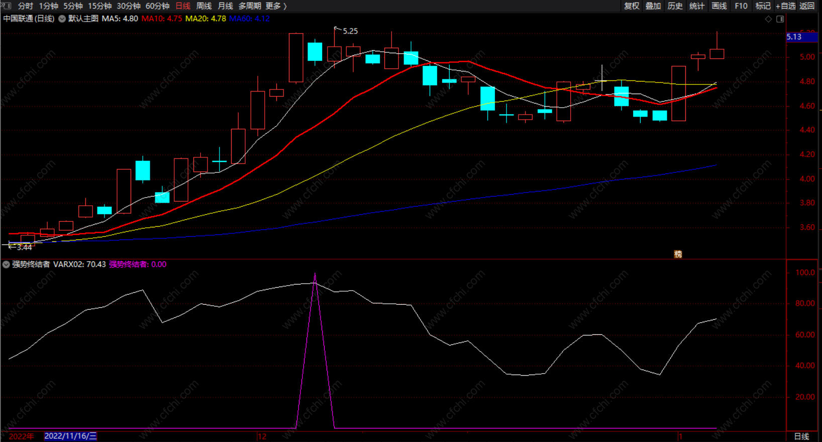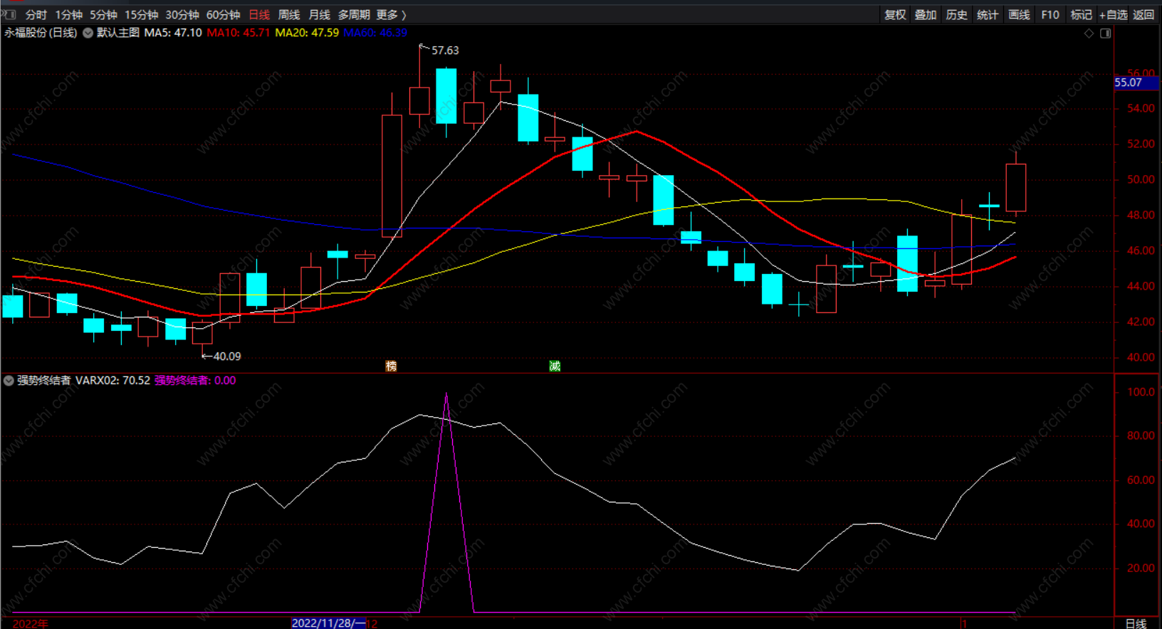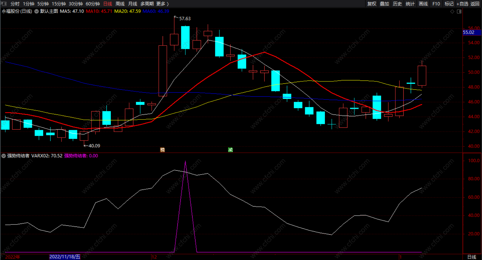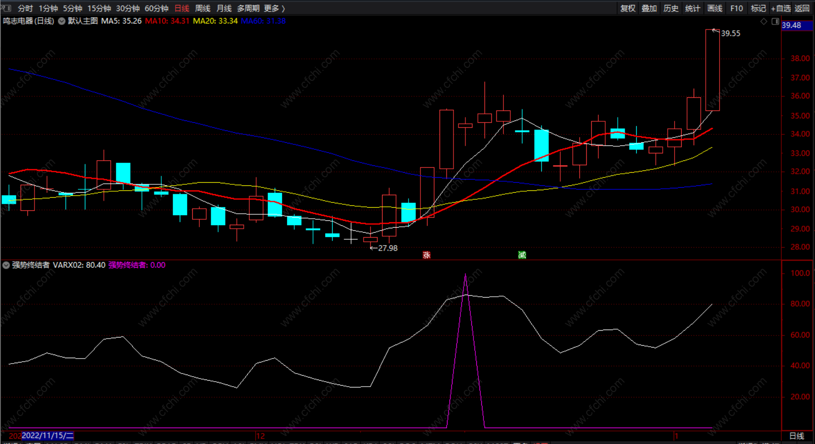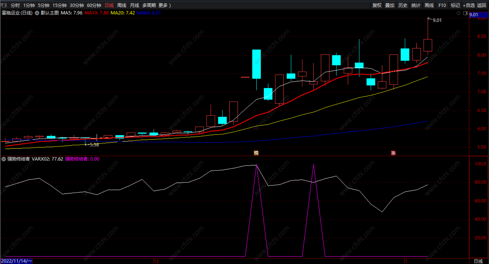 强势终结者:(REF(VARX03,1) AND VARX04 AND VARX02>80)*100,COLORFF00FF;