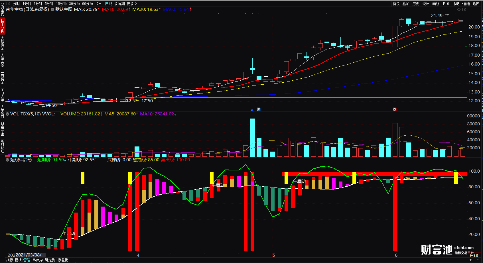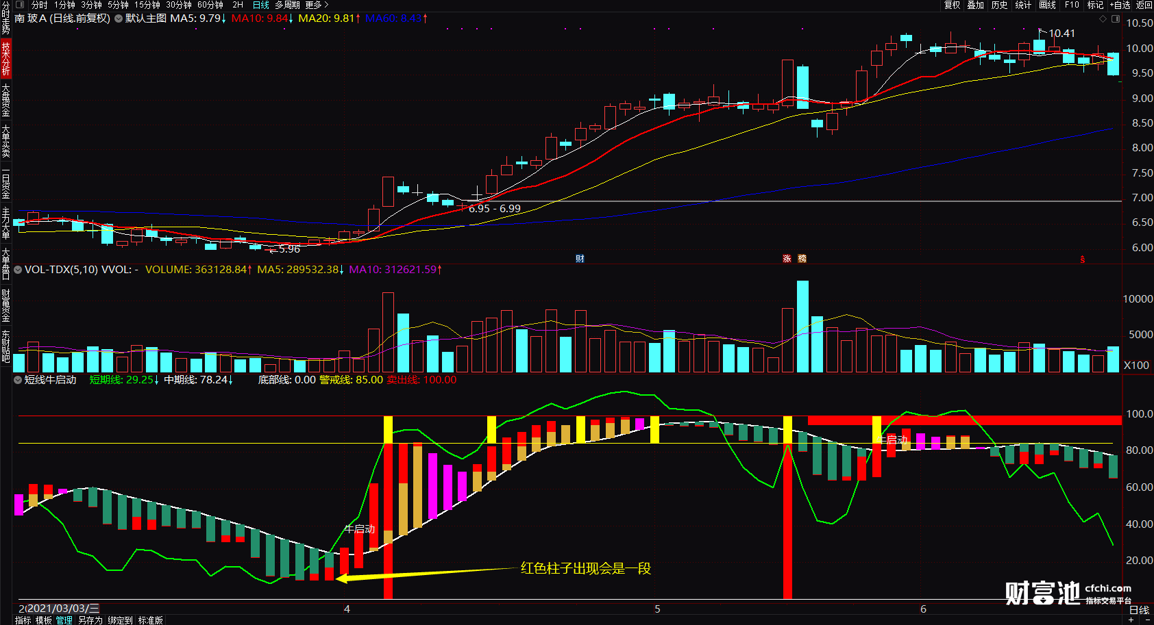 只做粉色或大红色区间波段“牛启动”信号参考买入,信号简单明确,通过颜色和柱子高低即可判断强弱,趋势,准确率高,绝无未来函数。