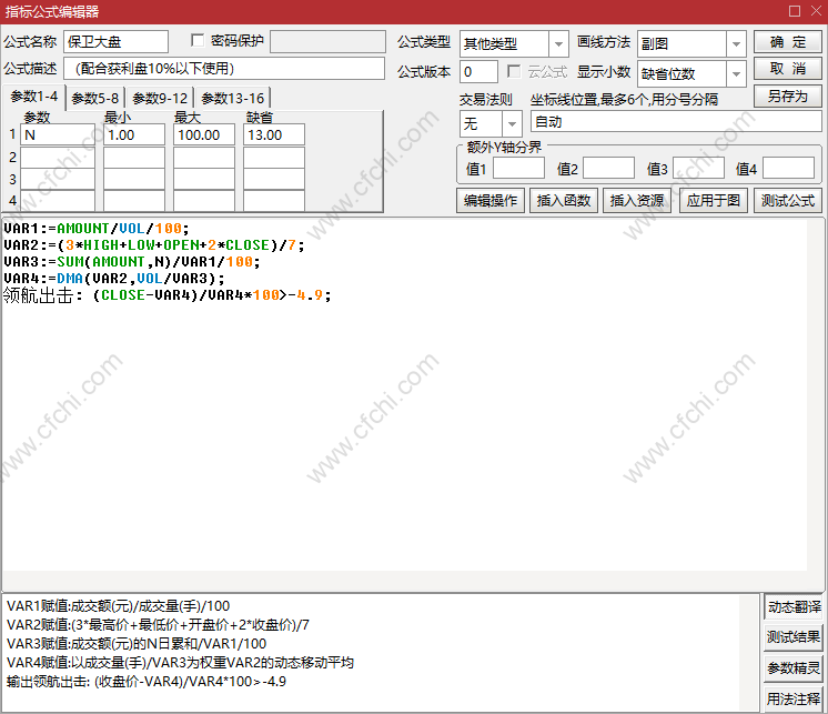 财富池指标公式网(www.cfchi.com)提醒您:指标公式是通过数学逻辑角度编写而来,仅是股票分析环节中的一个辅助工具,对股票选股效率和分析便捷上起到一定的作用,股市是具有不确定性和不可预测性的,请正常对待和使用指标公式!
