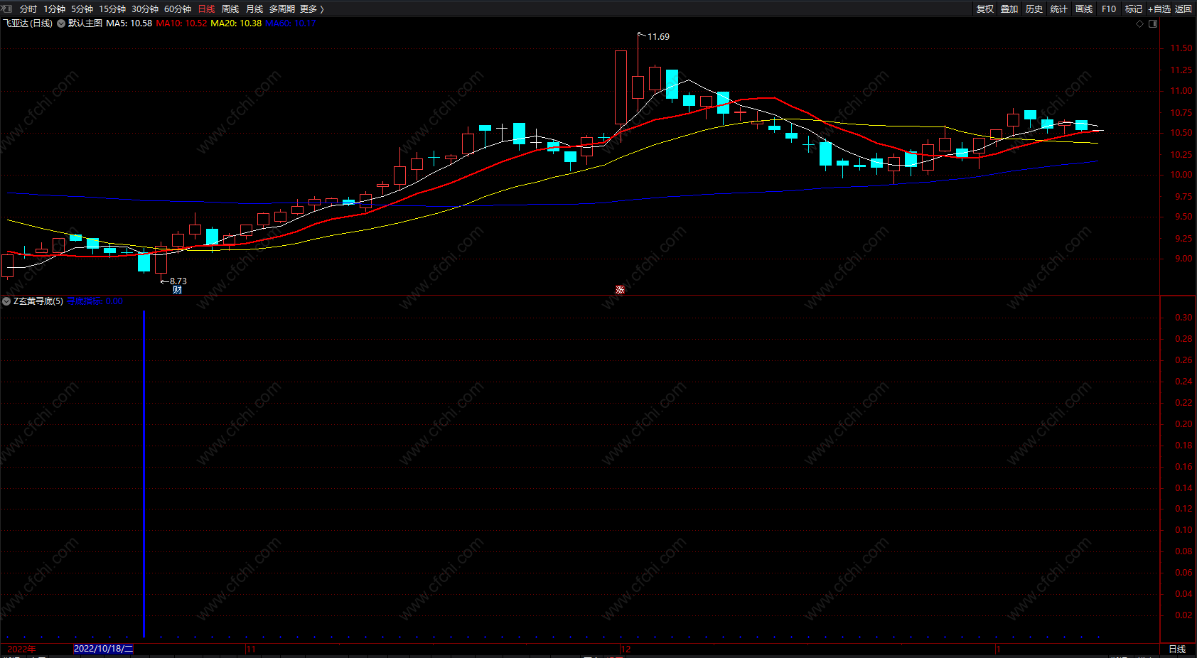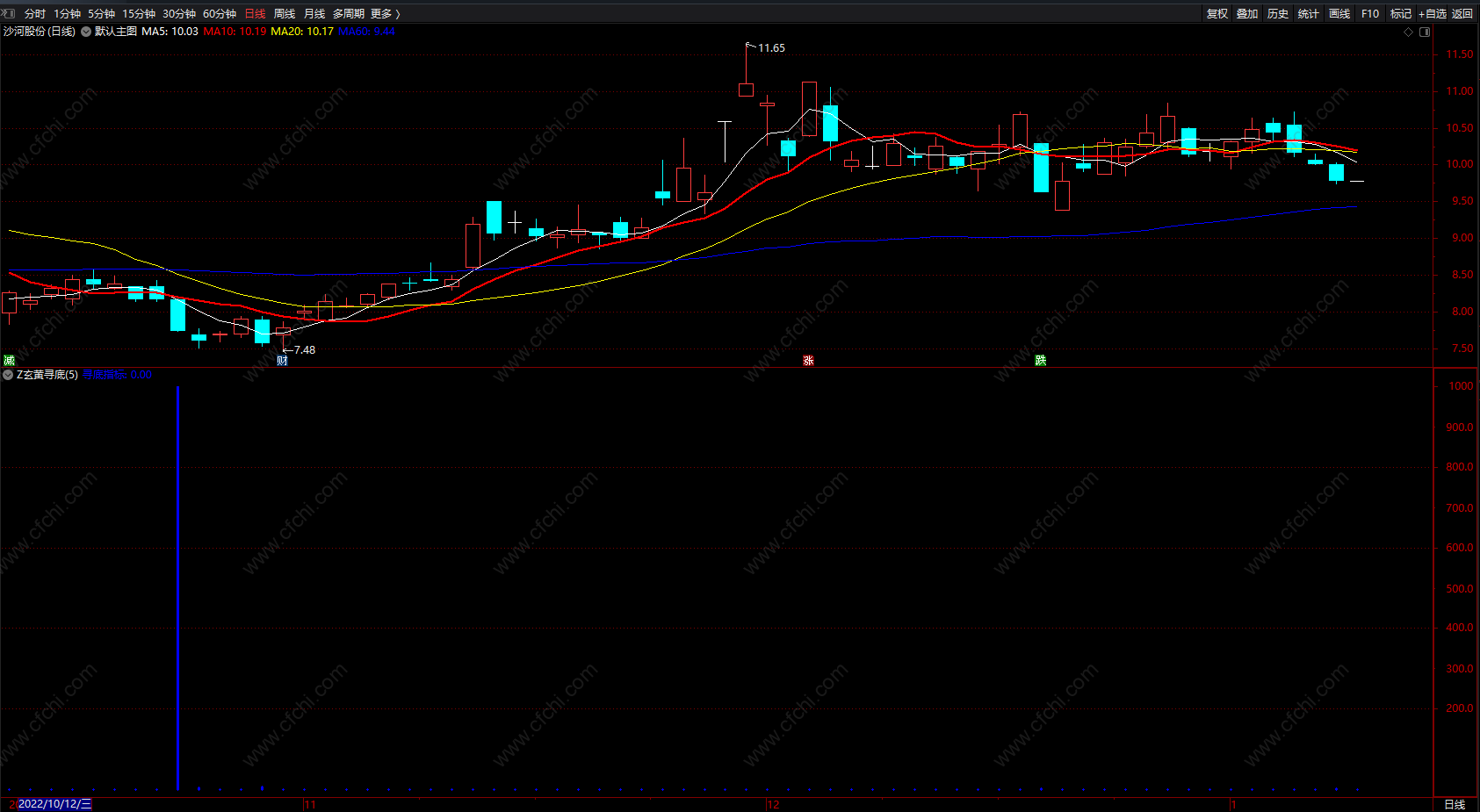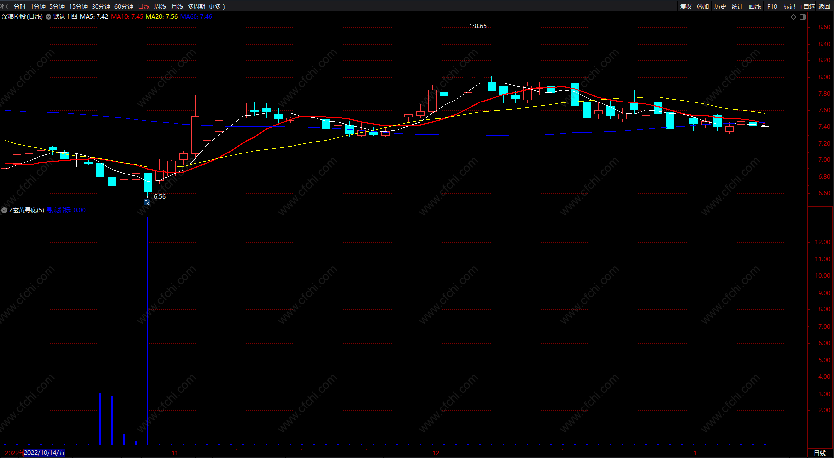 寻底指标:IF(HLP<N1/100,CM,0),,STICK,LINETHICK3,COLORBLUE;