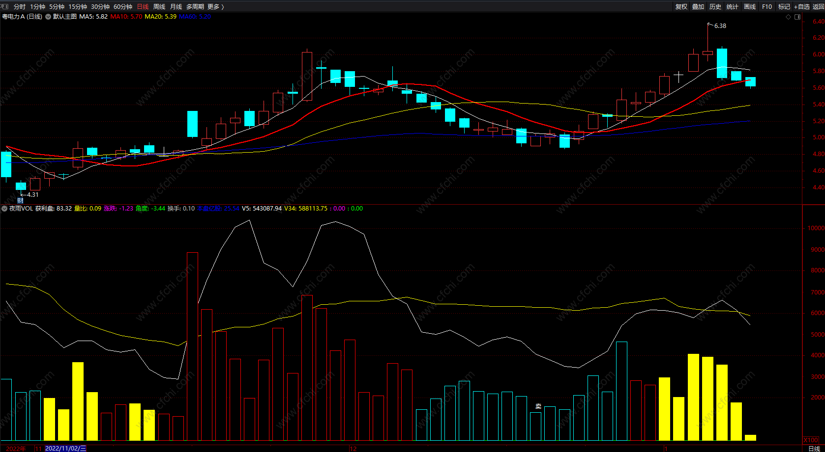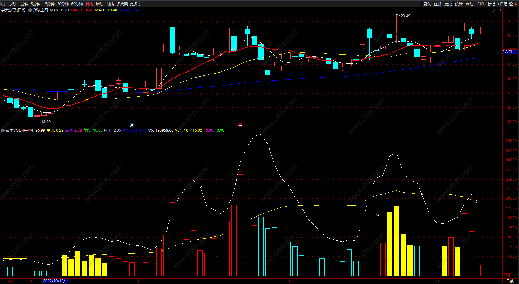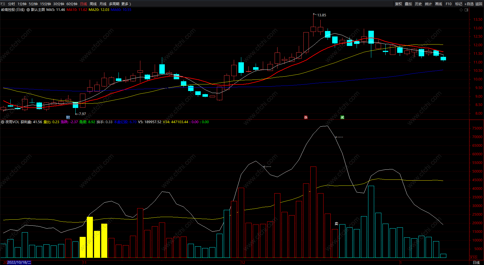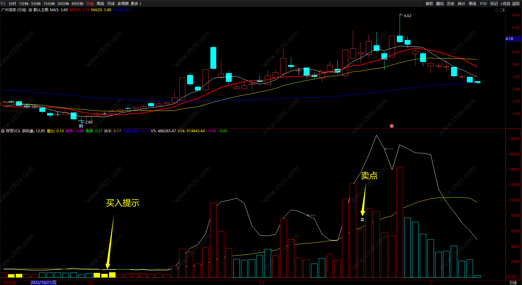 中间的彩色成交量柱用法已在左上注明,高灵敏度的短线指标;