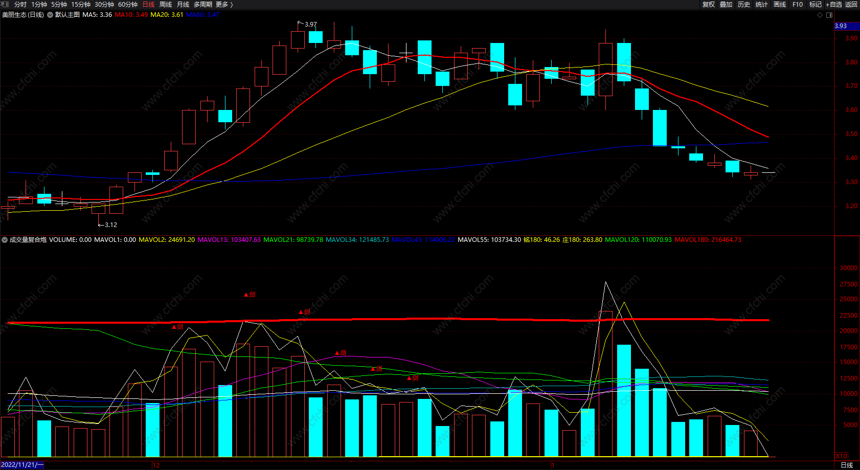 MAVOL180:MA(VOLUME,180)*1.2,COLORRED,LINETHICK4;