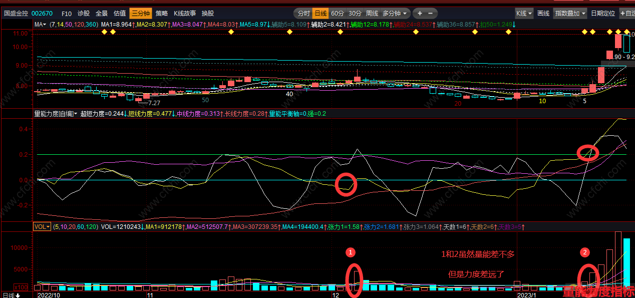 (【益盟操盘手】量能力度副图指标,结合成交量来提高突破的成功率,源码分享)