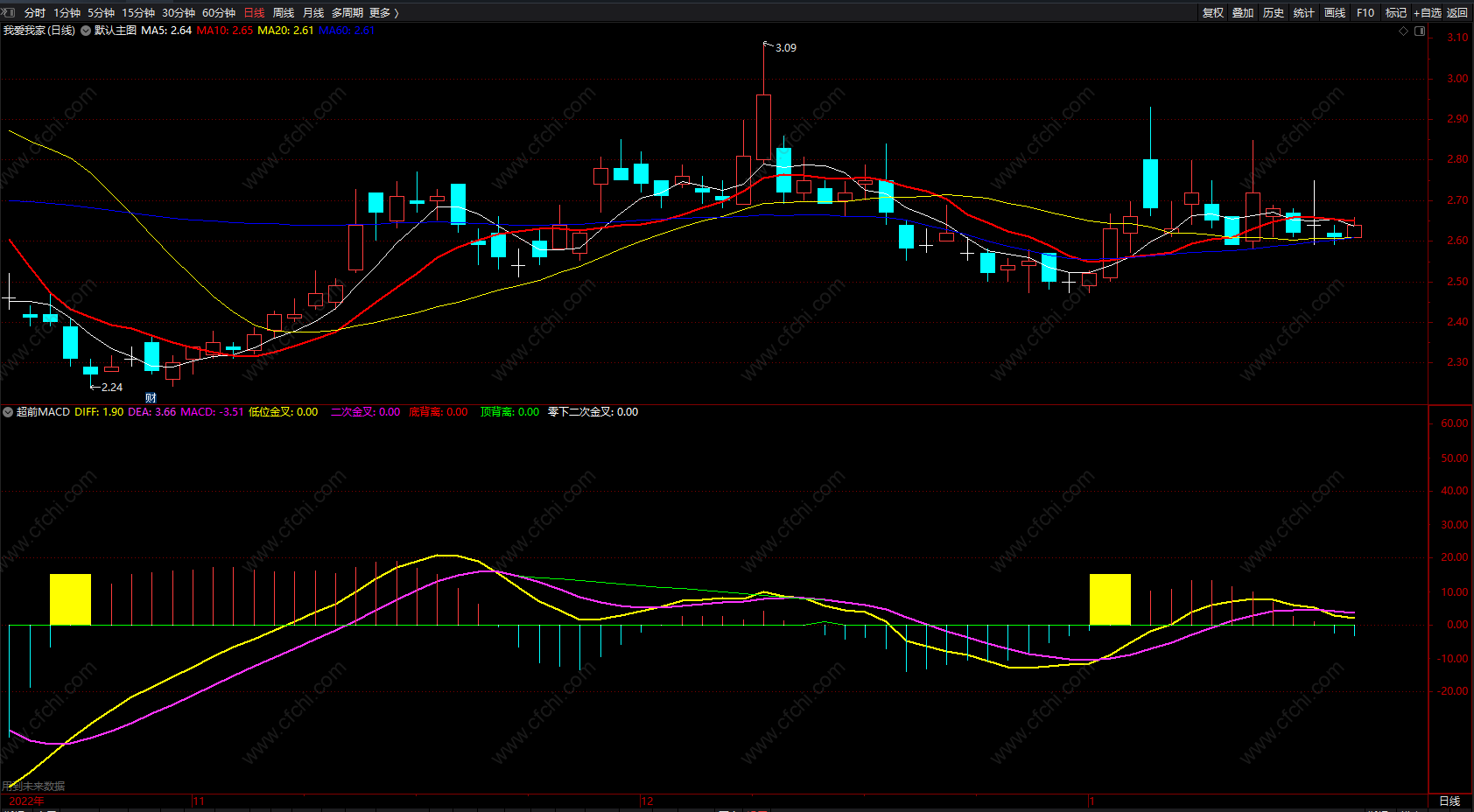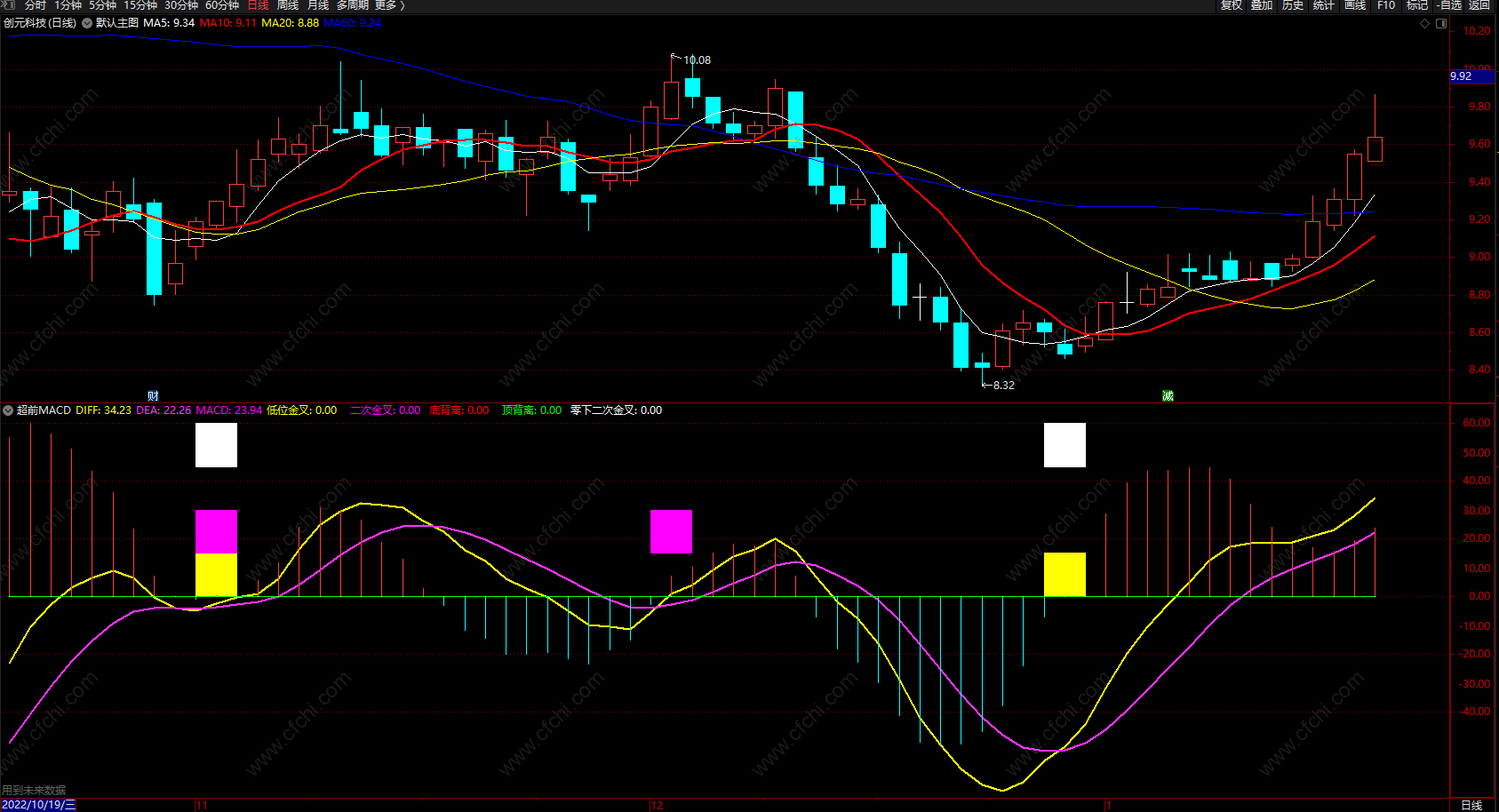 蓝色柱、黄线下穿玫红色线表示MACD在0轴以下下跌趋势.