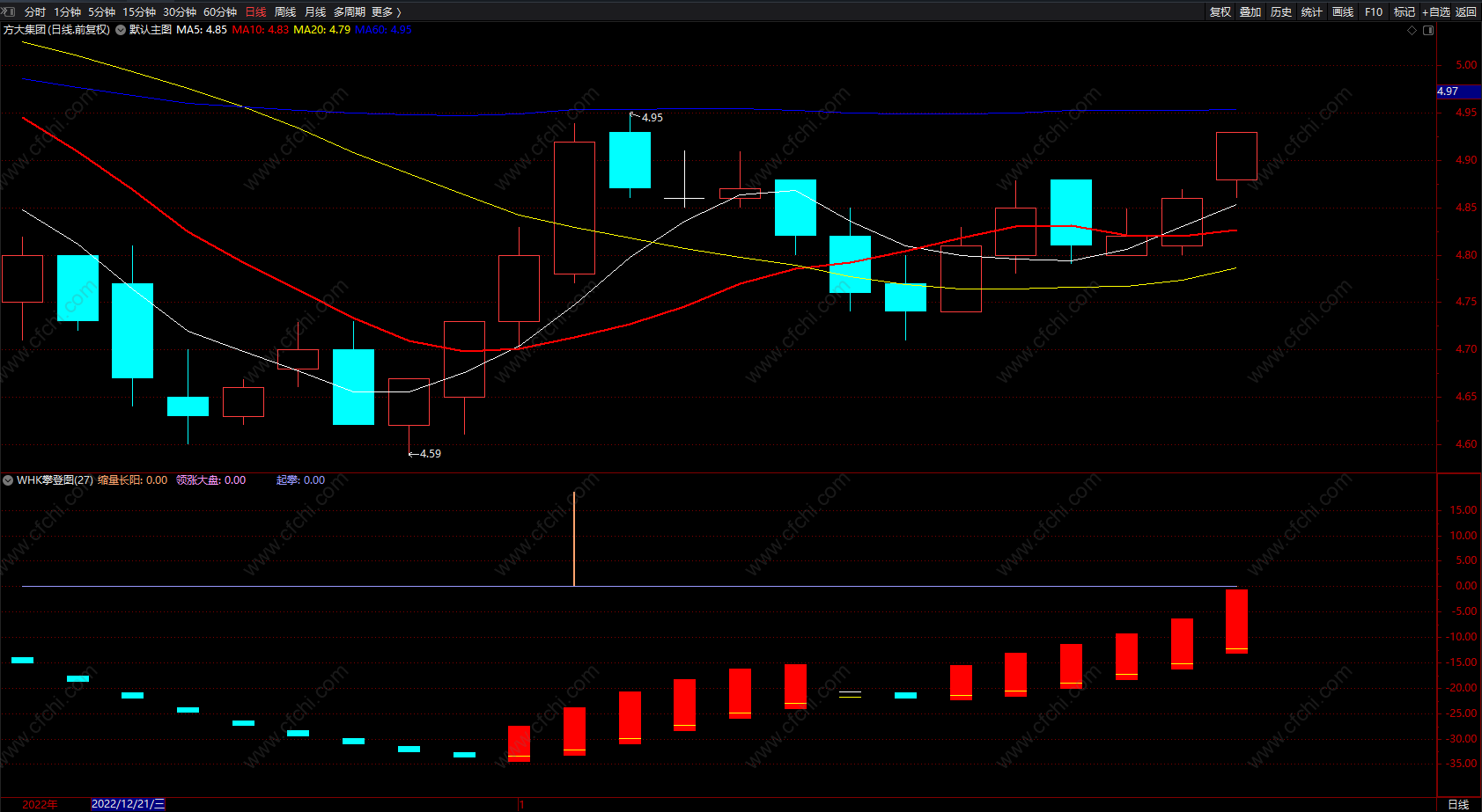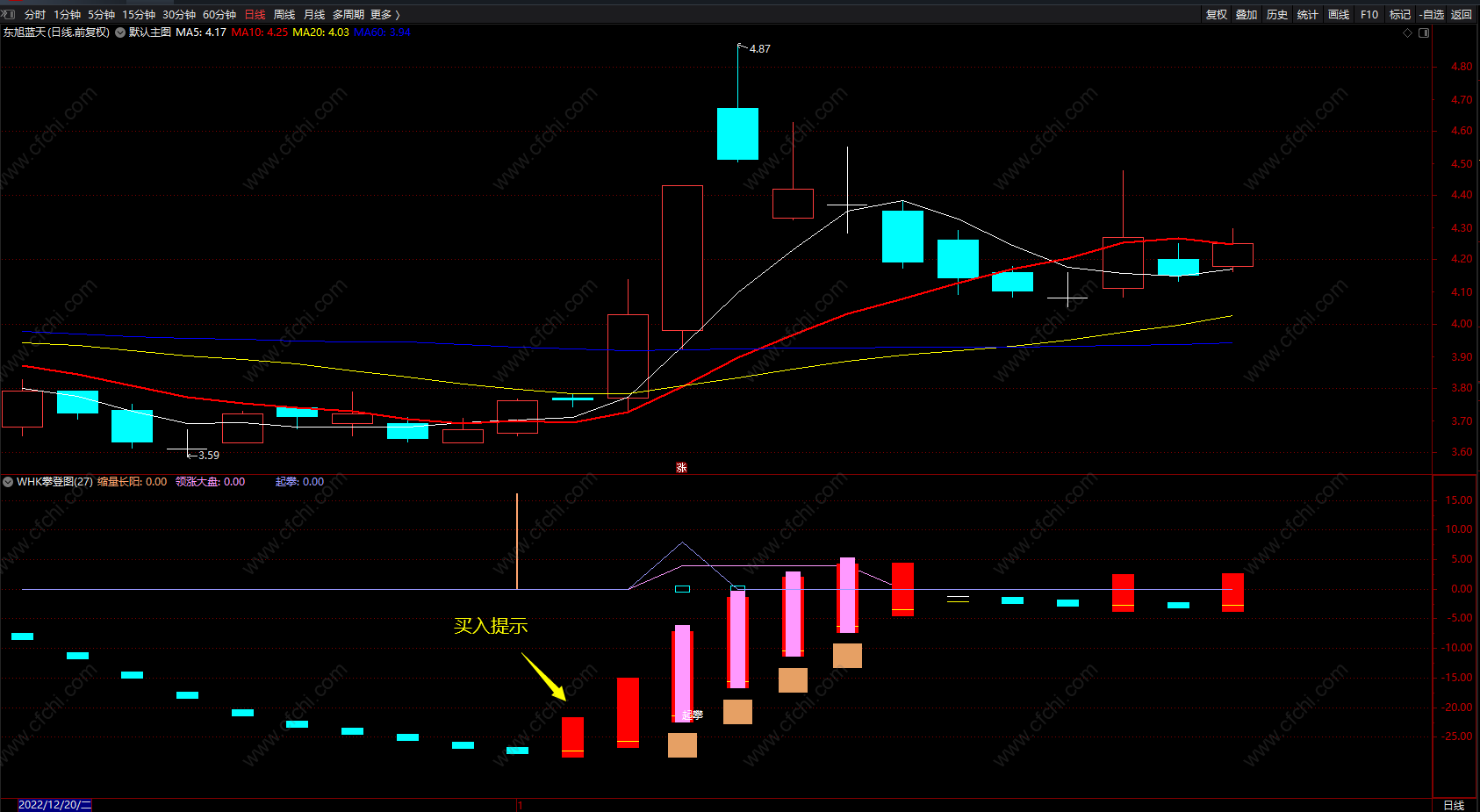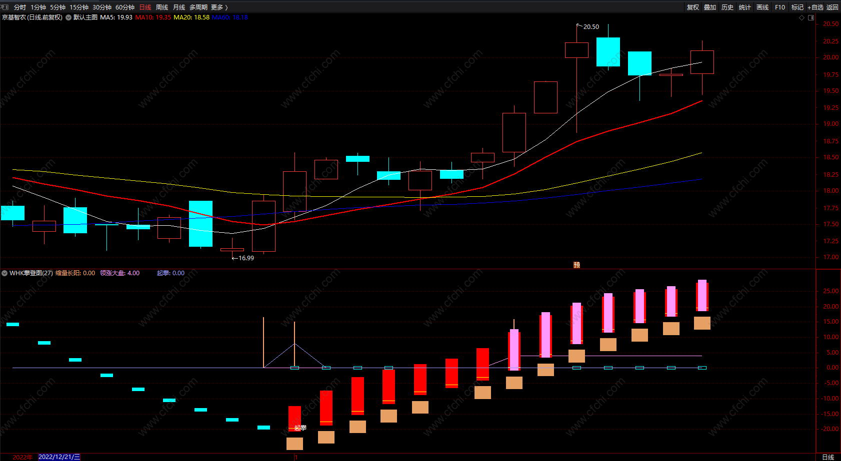 WHK攀登图(换手率、中线趋势、领涨大盘)粉色柱出现买入信号,红柱可追涨;蓝色柱为下跌趋势!