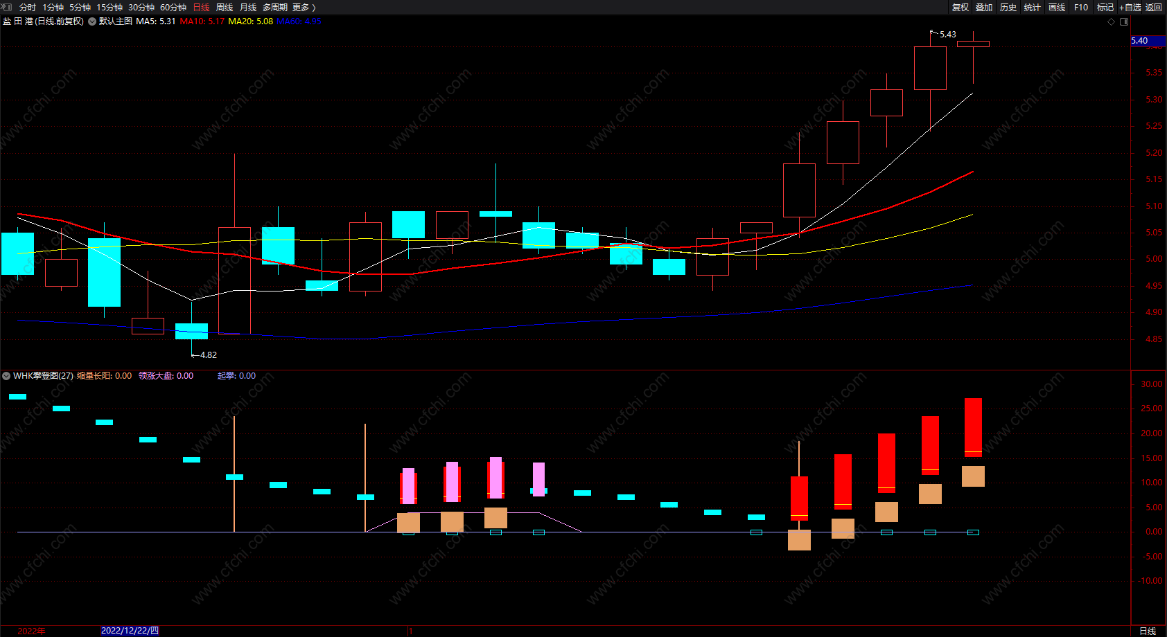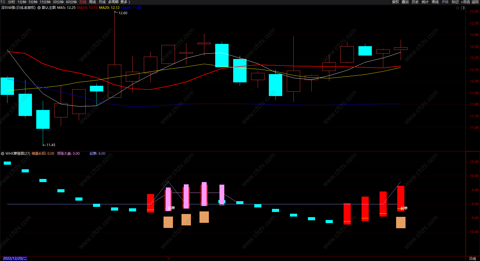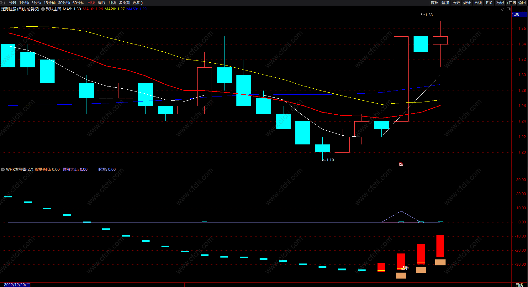 WHK攀登图(换手率、中线趋势、领涨大盘)粉色柱出现买入信号,红柱可追涨;蓝色柱为下跌趋势!