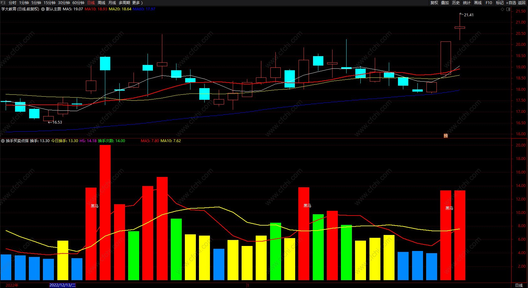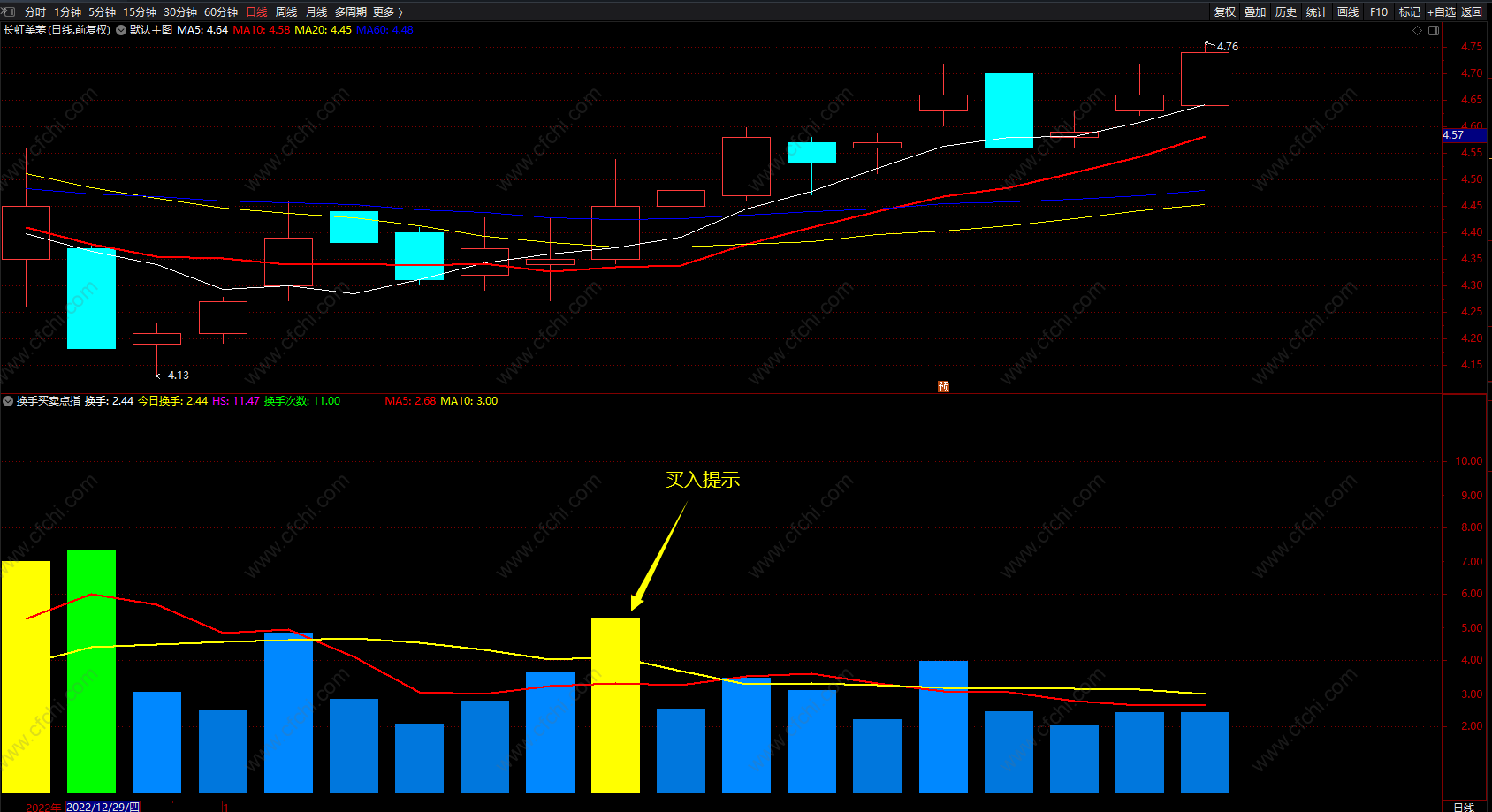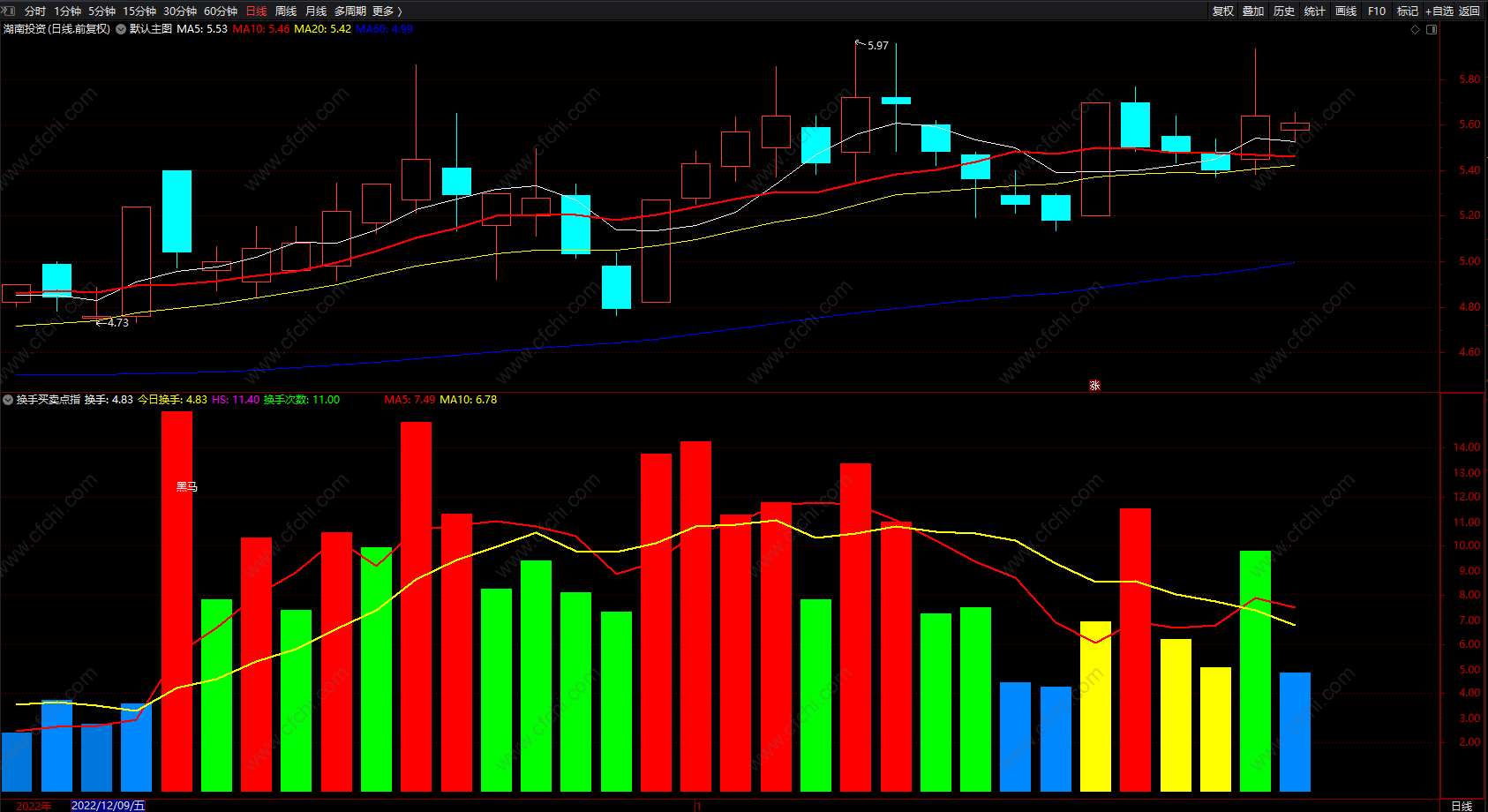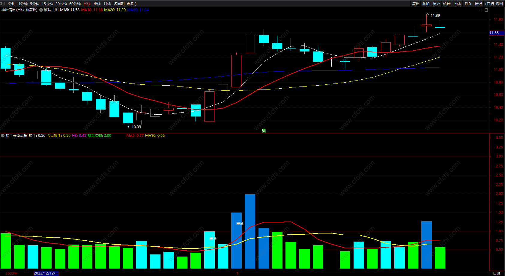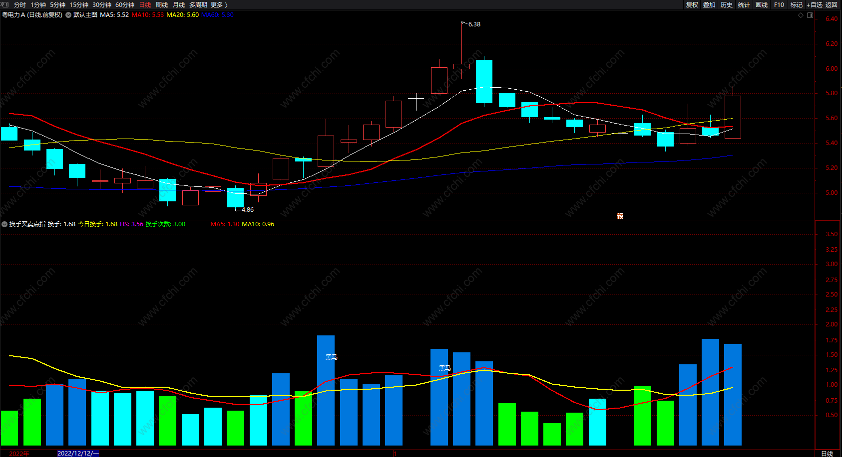 此指标将换手率的数值以柱状表示,并配有5日换手均线与10日换手均线,就跟成交量的vol指标差不多,当换手率由小变大到10%,并且这时成交量是前一天的2倍以上,则出现一个"黑马"的信号。
