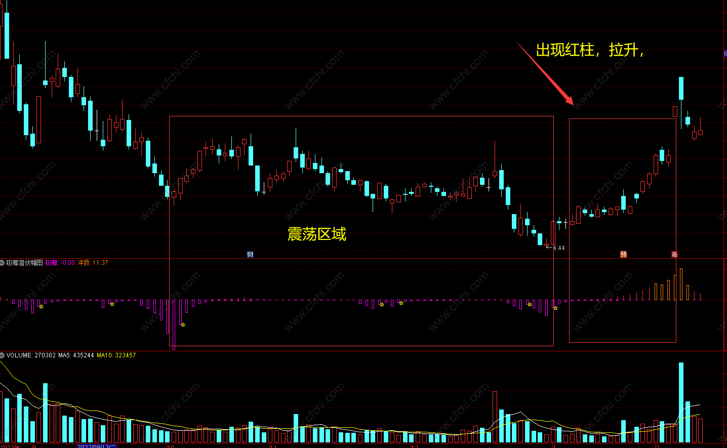 2、成交量放量,柱体红色区域拉升逐步可以考虑介入