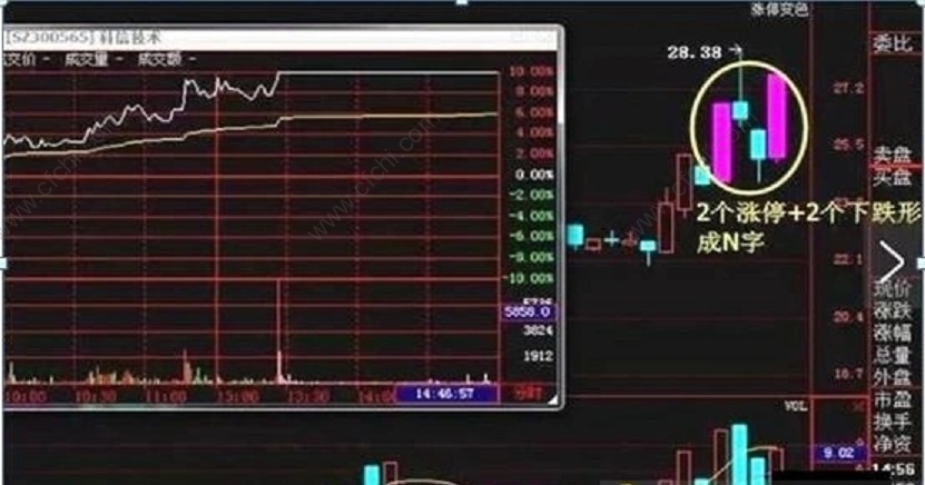 3、股价在上涨时,再次出现涨停板,形成N字!