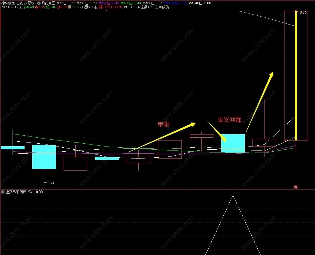 指标包含:1个金叉串阳回踩副图+ 1个选股指标,源码分享无未来;