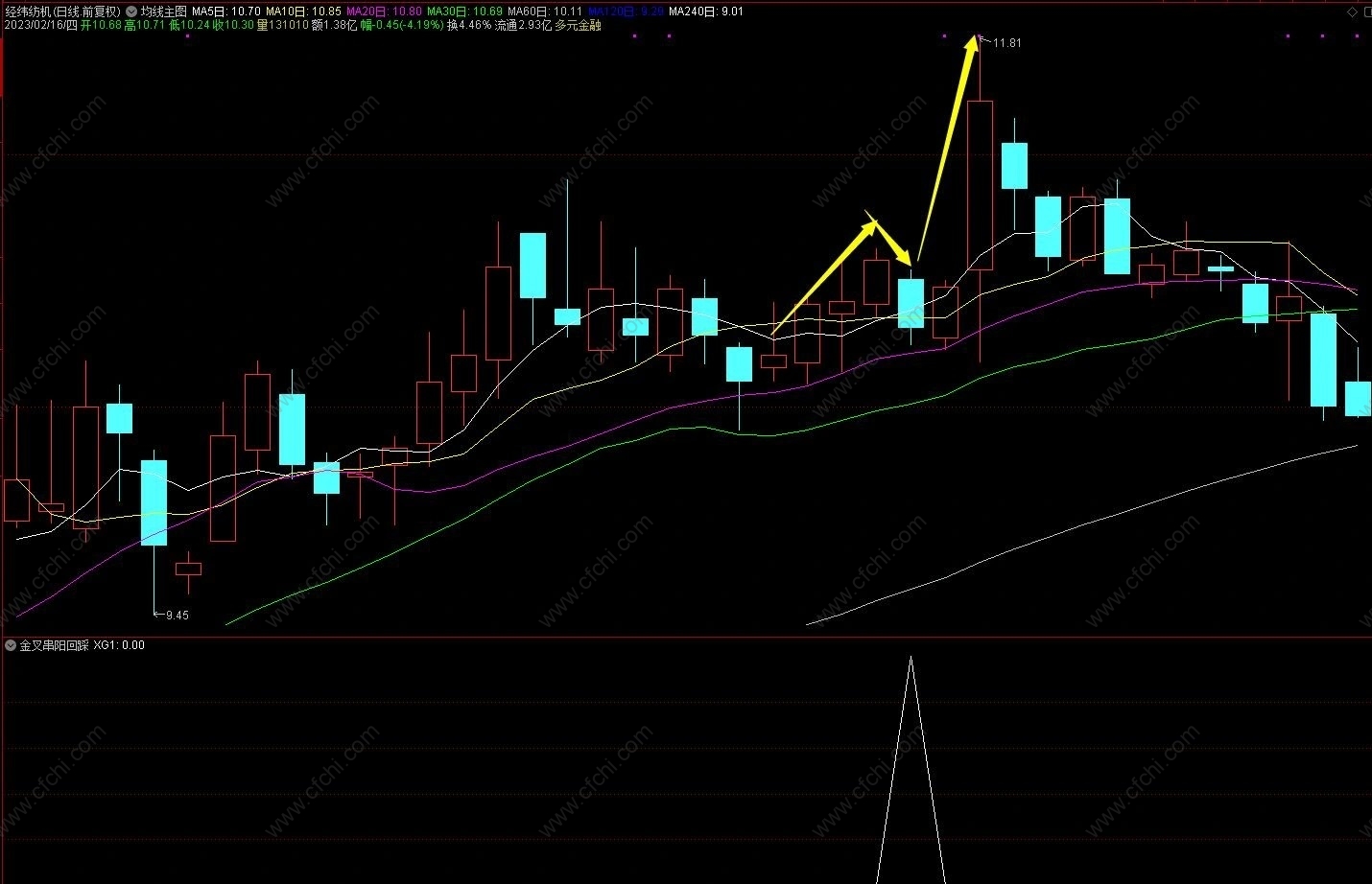 连续3个阳线后出现阴线回踩,5日和10日均线由死叉变为金叉,此时阴线位置是个不错的介入点。