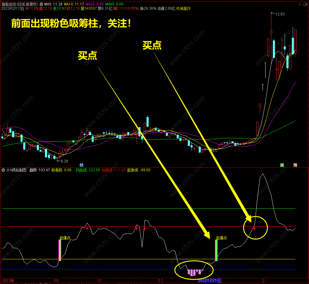 操盘要点:极弱线(蓝色虚影线下方出现粉色吸筹柱)之后出现起爆点信号,为极佳介入时机;出现红色小箭头也是买点信号。出现信号时尽量选择60日均线走平或者开始拐头向上倾斜的。