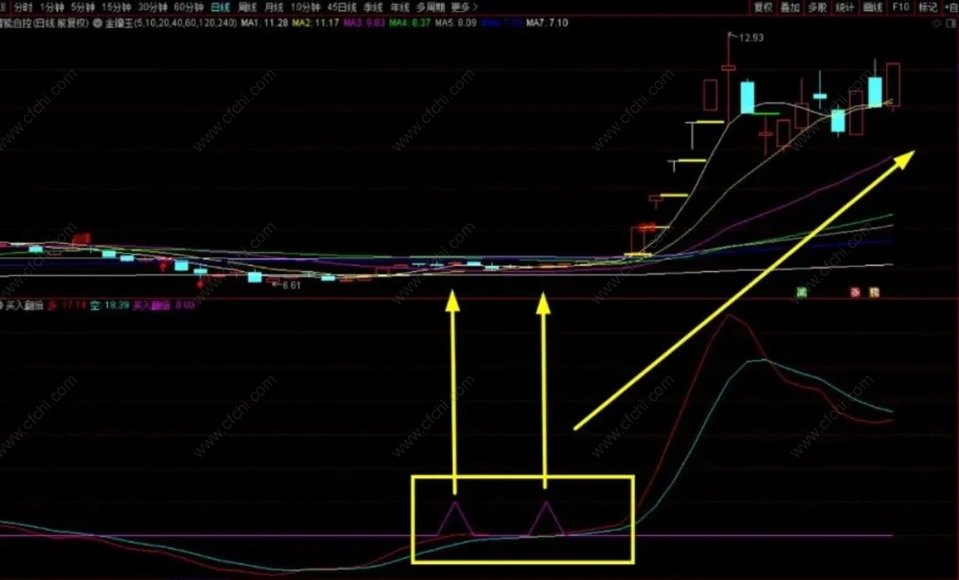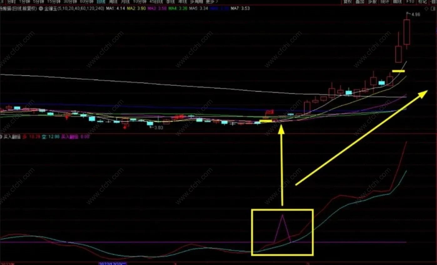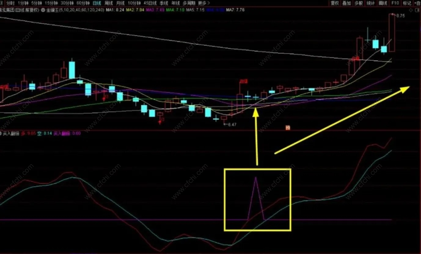 (通达信更新版买入翻倍副图选股指标,多空线上穿0轴以后并且沿着45度向上为有效,源码分享!)