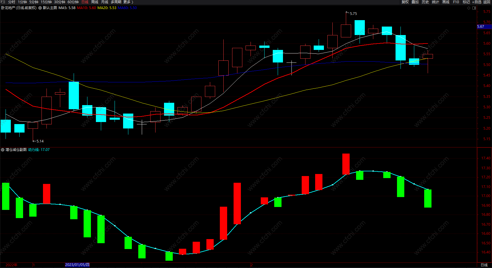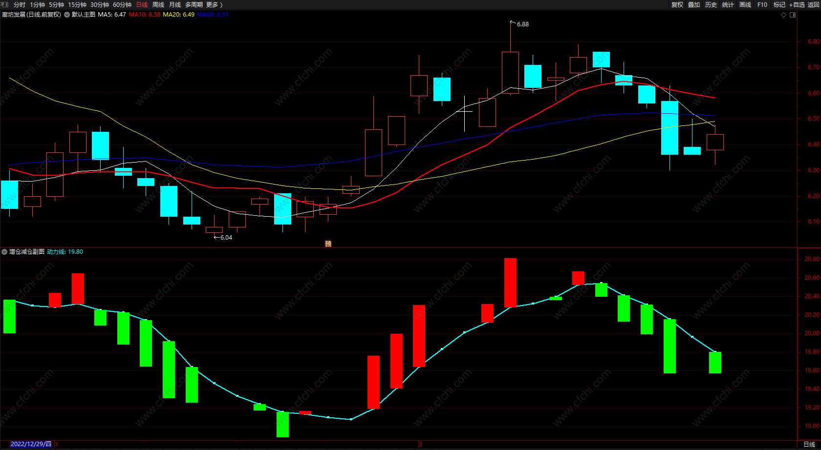 V1:=10000*C/INDEXC; V2:=10000*O/INDEXO; 动力线:MA(V1,5),LINETHICK2,COLORCYAN; STICKLINE(V1>=V2 AND V1>动力线,V1,动力线,2,0),COLORRED; STICKLINE(V1<V2 AND V1<=动力线,动力线,V1,2,0),COLORGREEN;