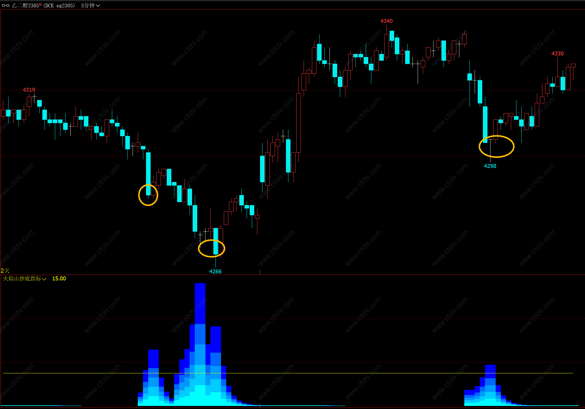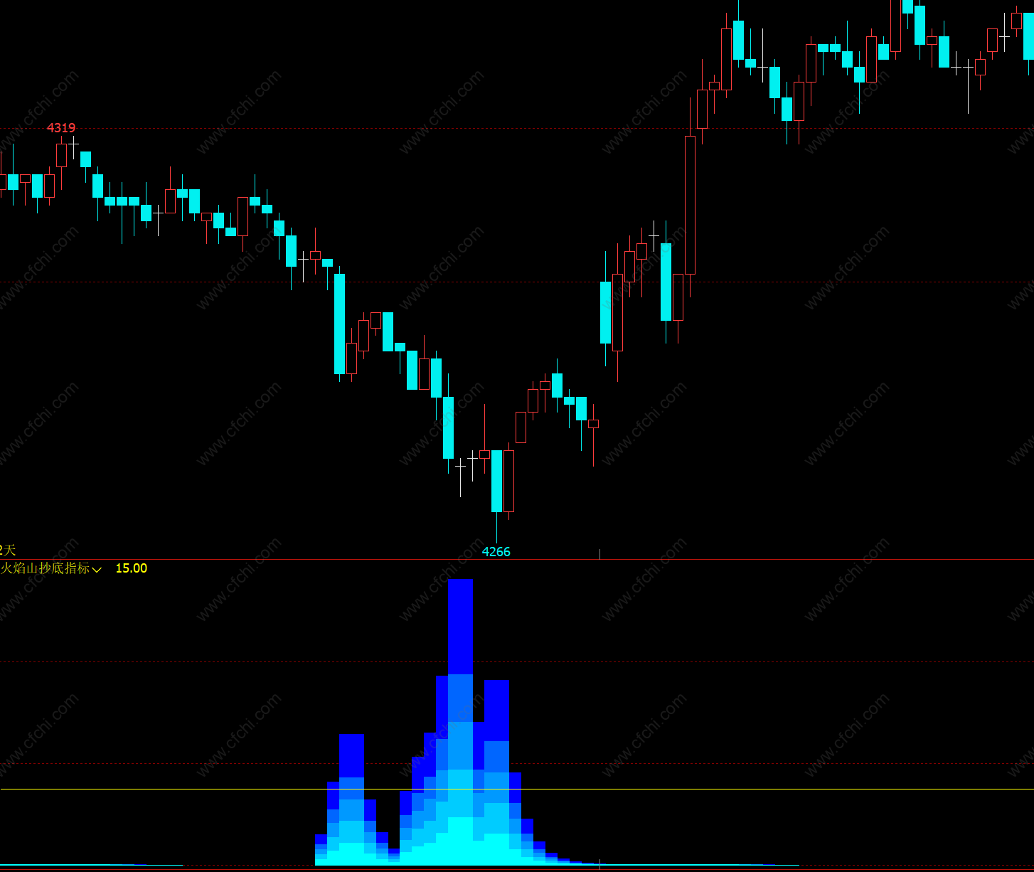 (【期货指标公式大全】火焰山抄底指标,期货量能分析)