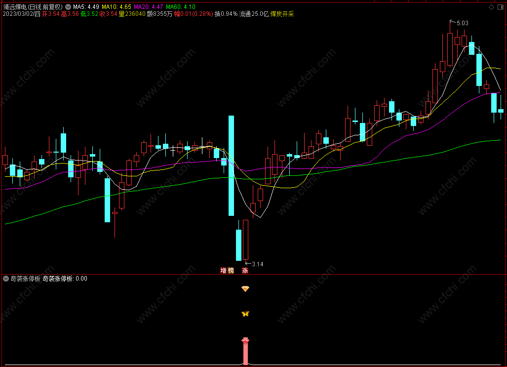 4、如果股票是强势封涨停板,那么股票后续上涨的概率较大,而今天韩老师给大家分享的指标就是叫大家寻找当日出现强势涨停,在此之前或者第二天我们有机会可以及时介入的股票。
