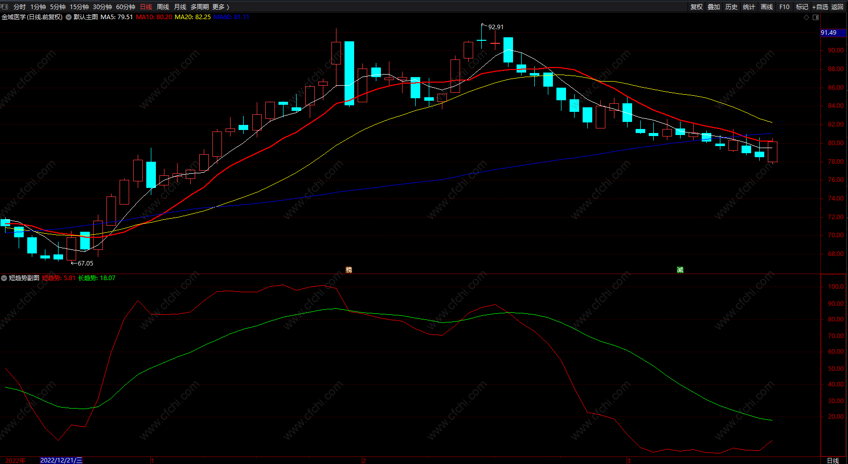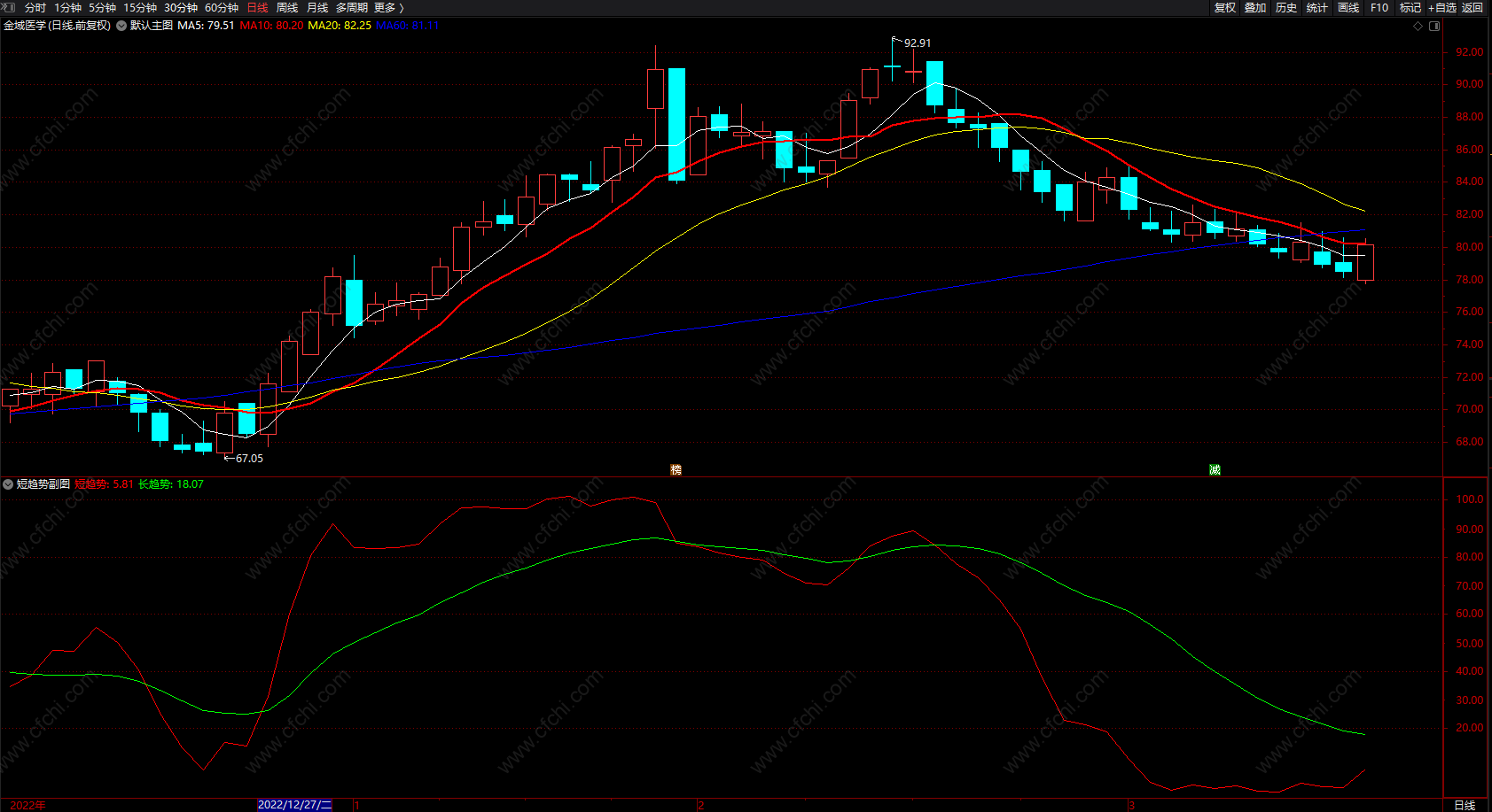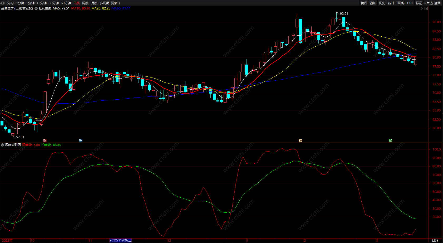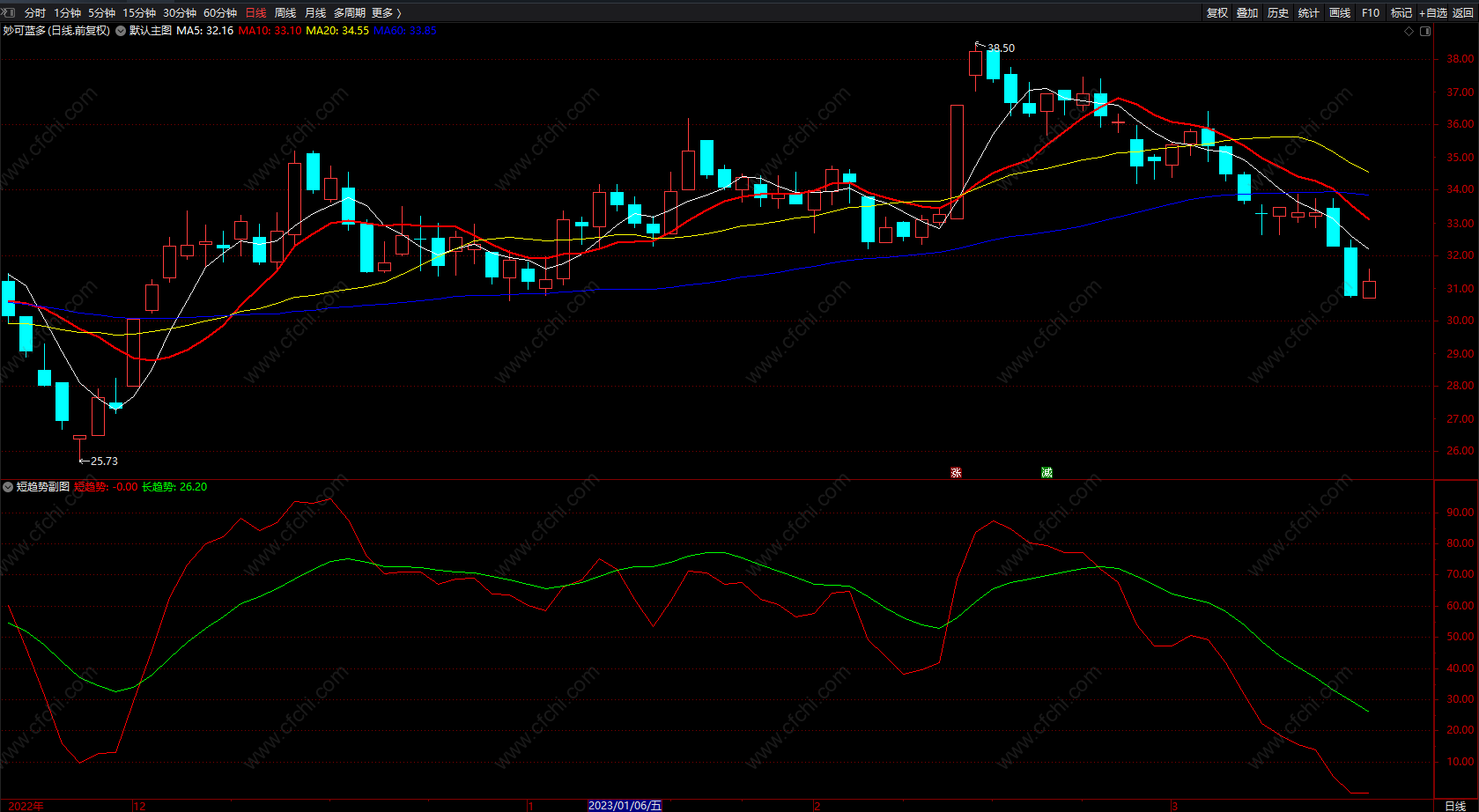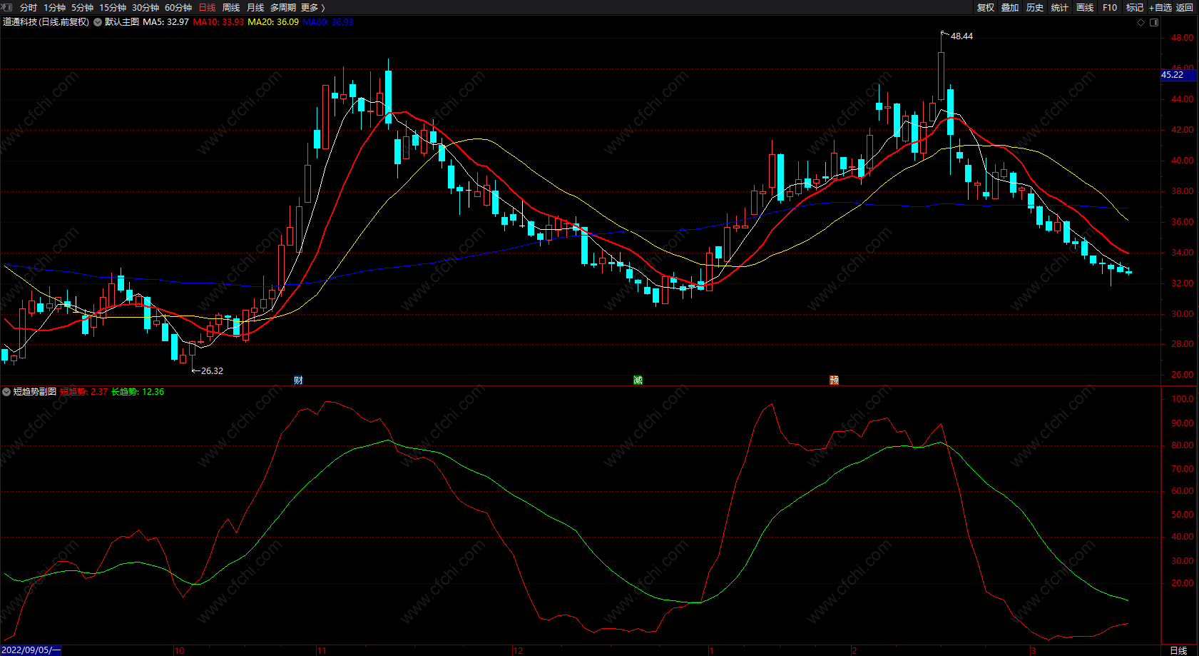 短趋势,长趋势提示指标 通达信两线副图指标 无未来 源码