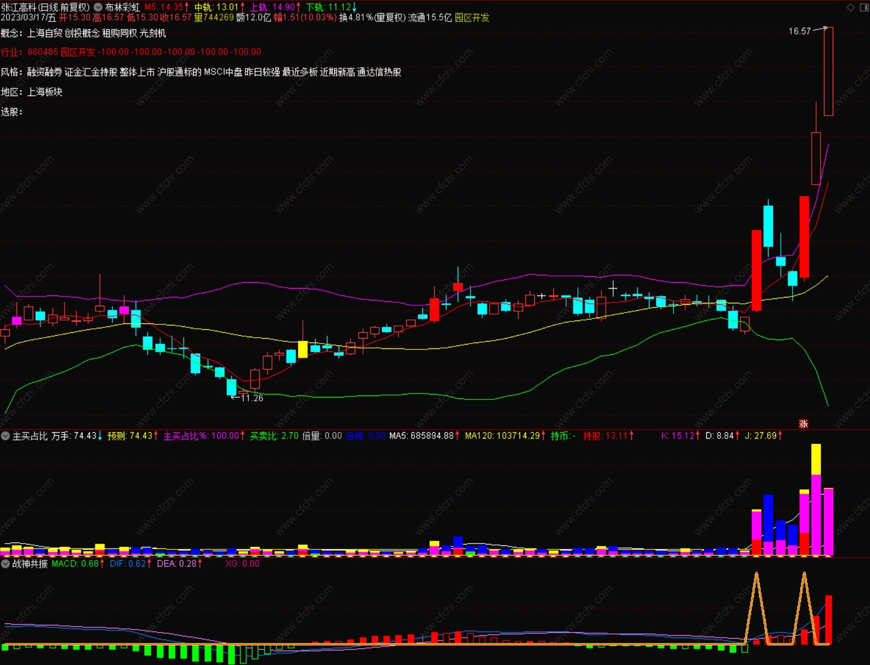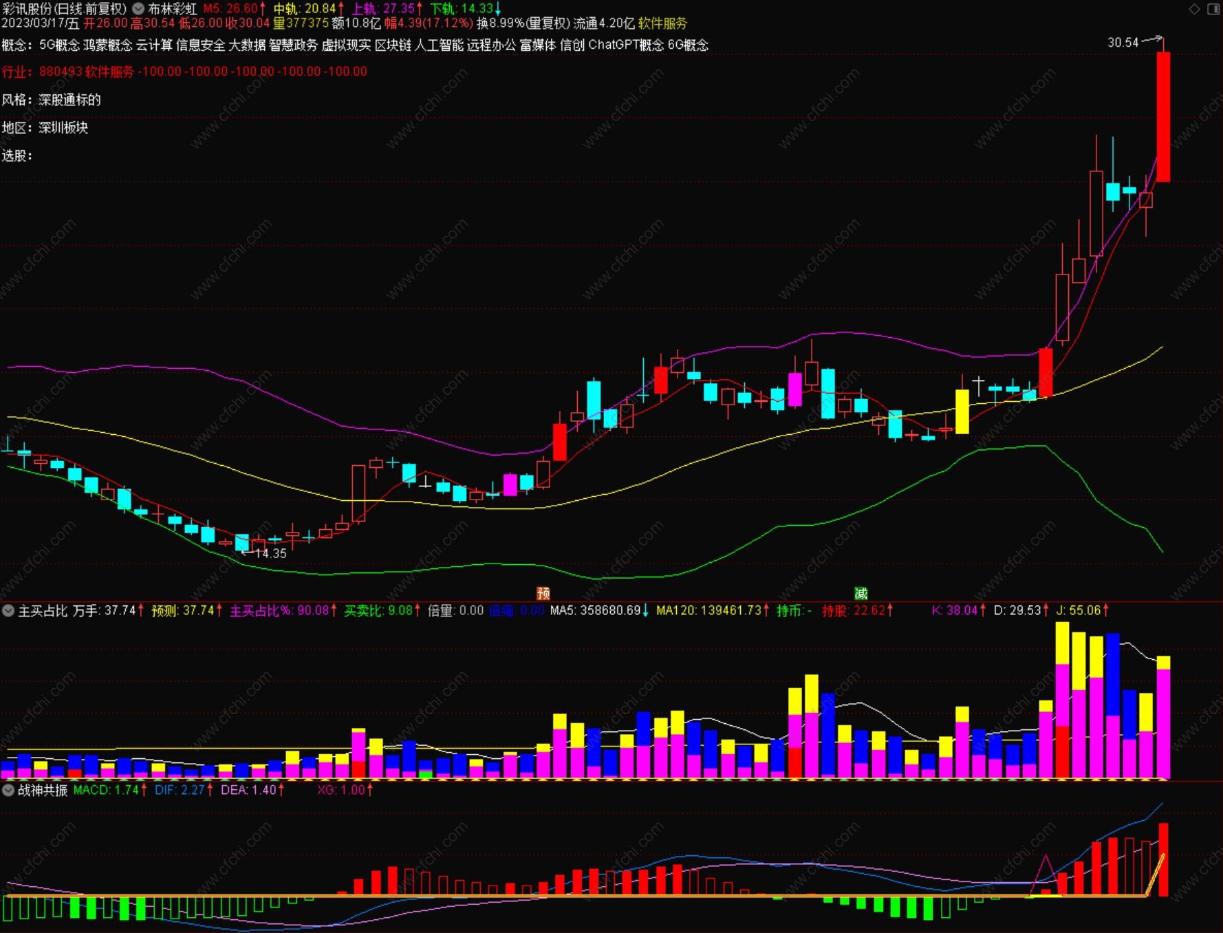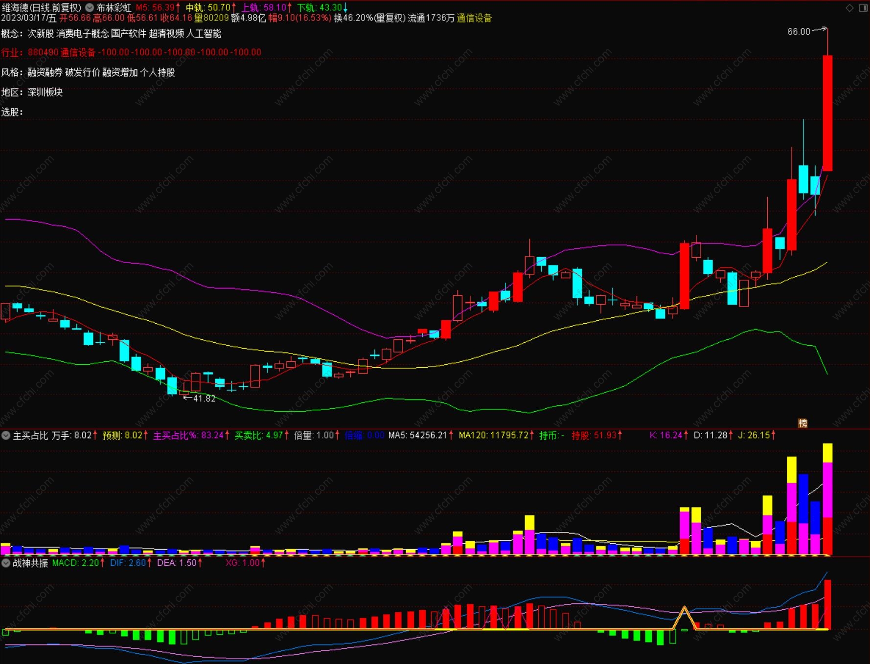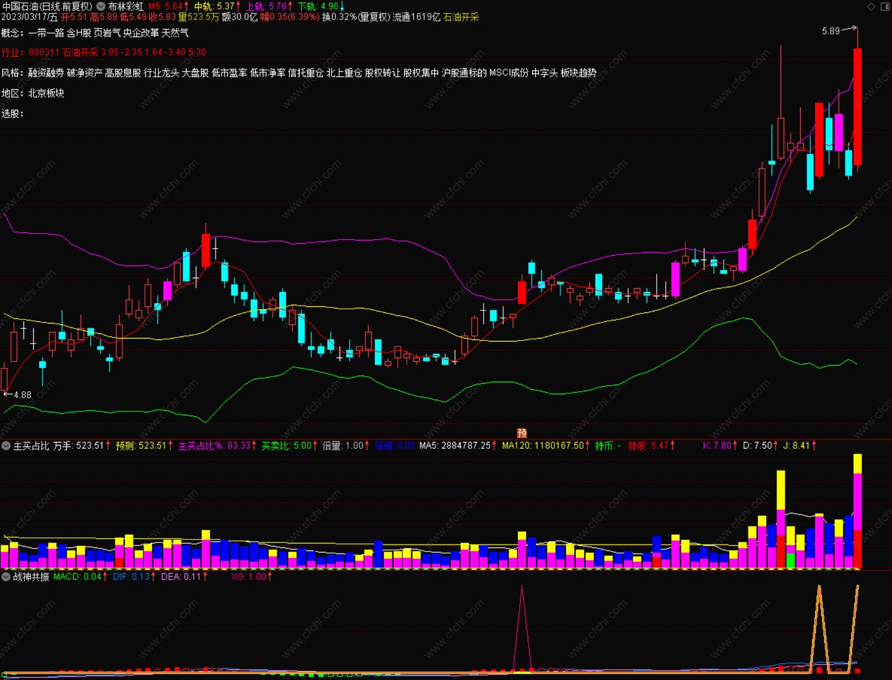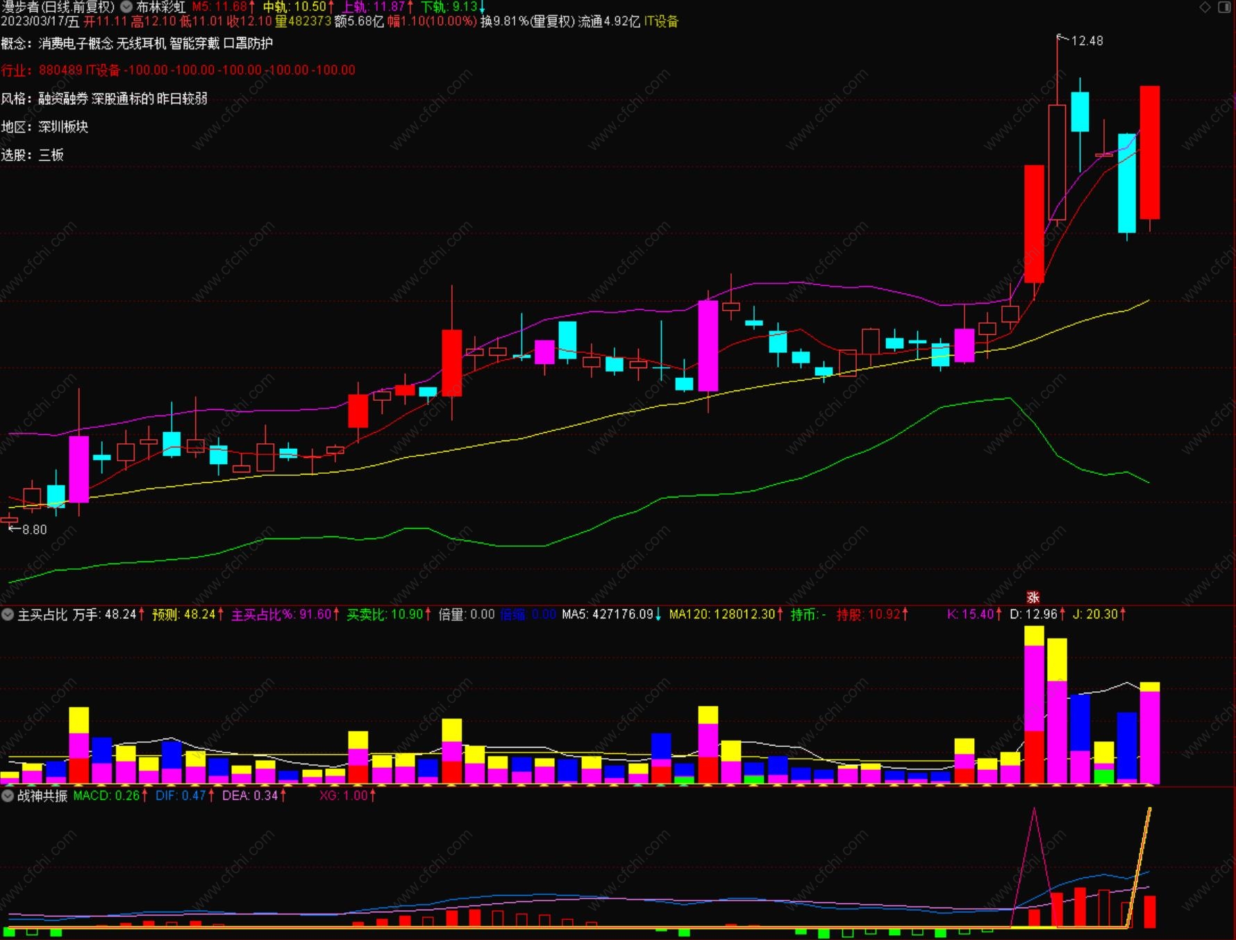 (战神共振副图,最近每天轻松抓牛股的指标公式,有布林彩虹、主买占比、红中红等共振信号)