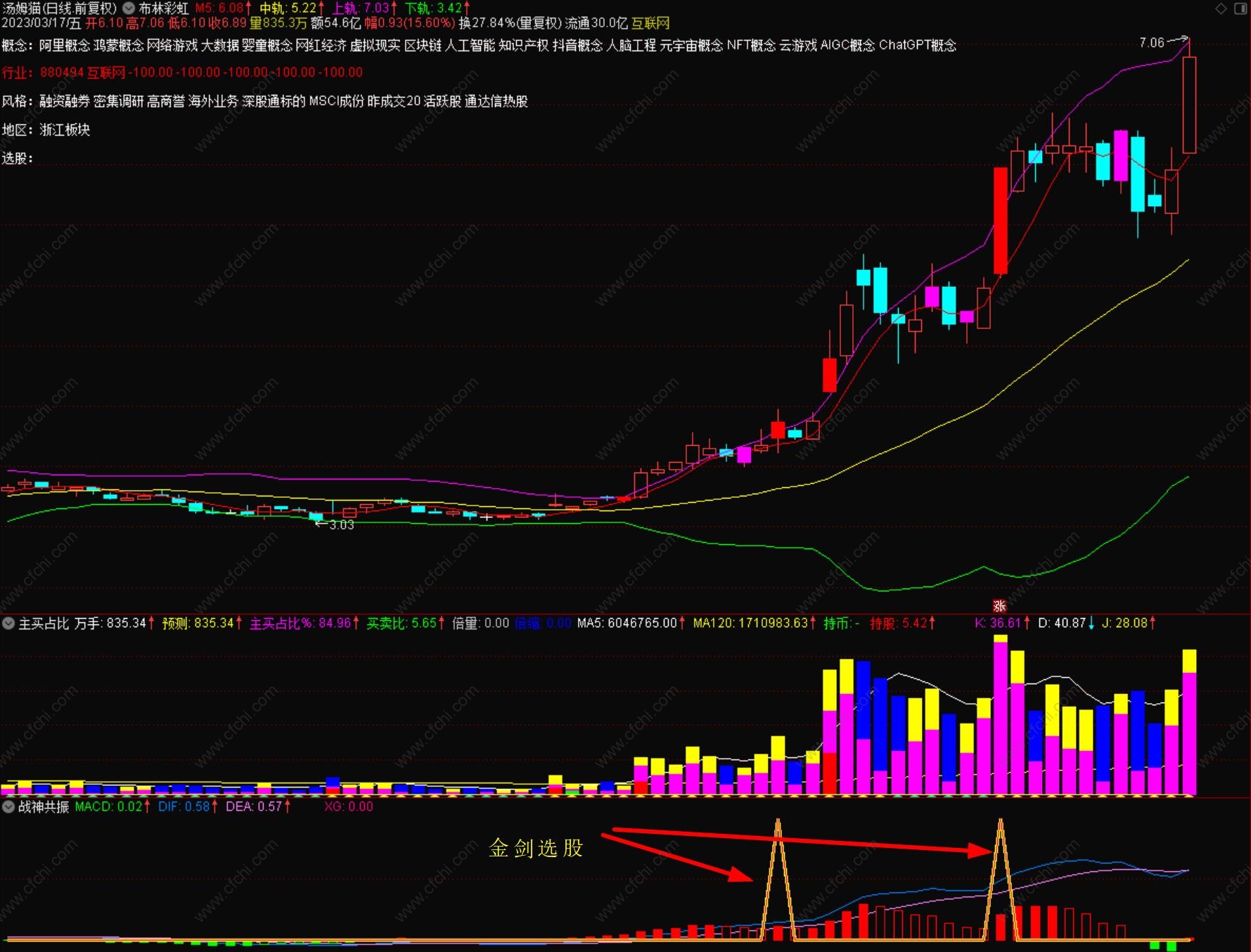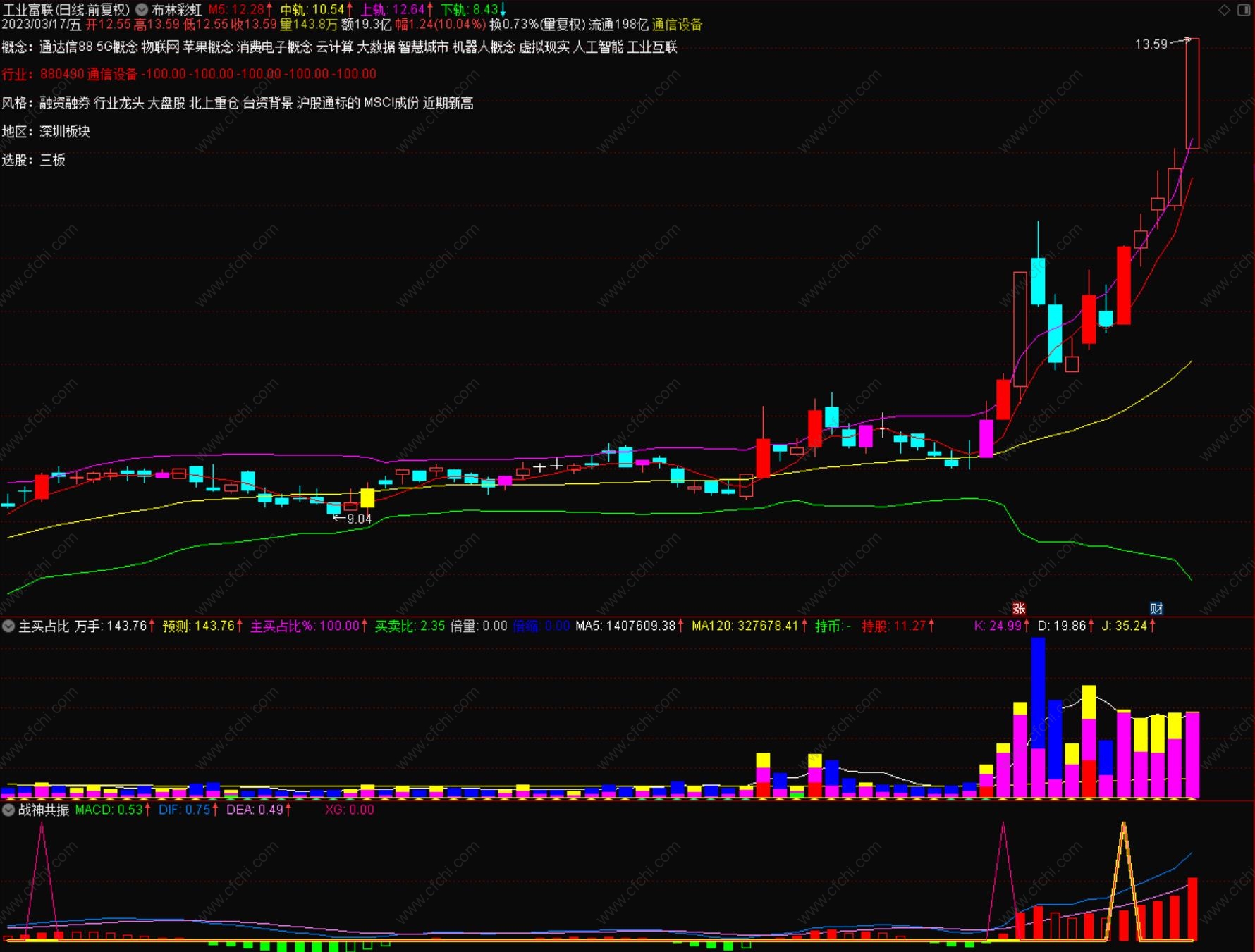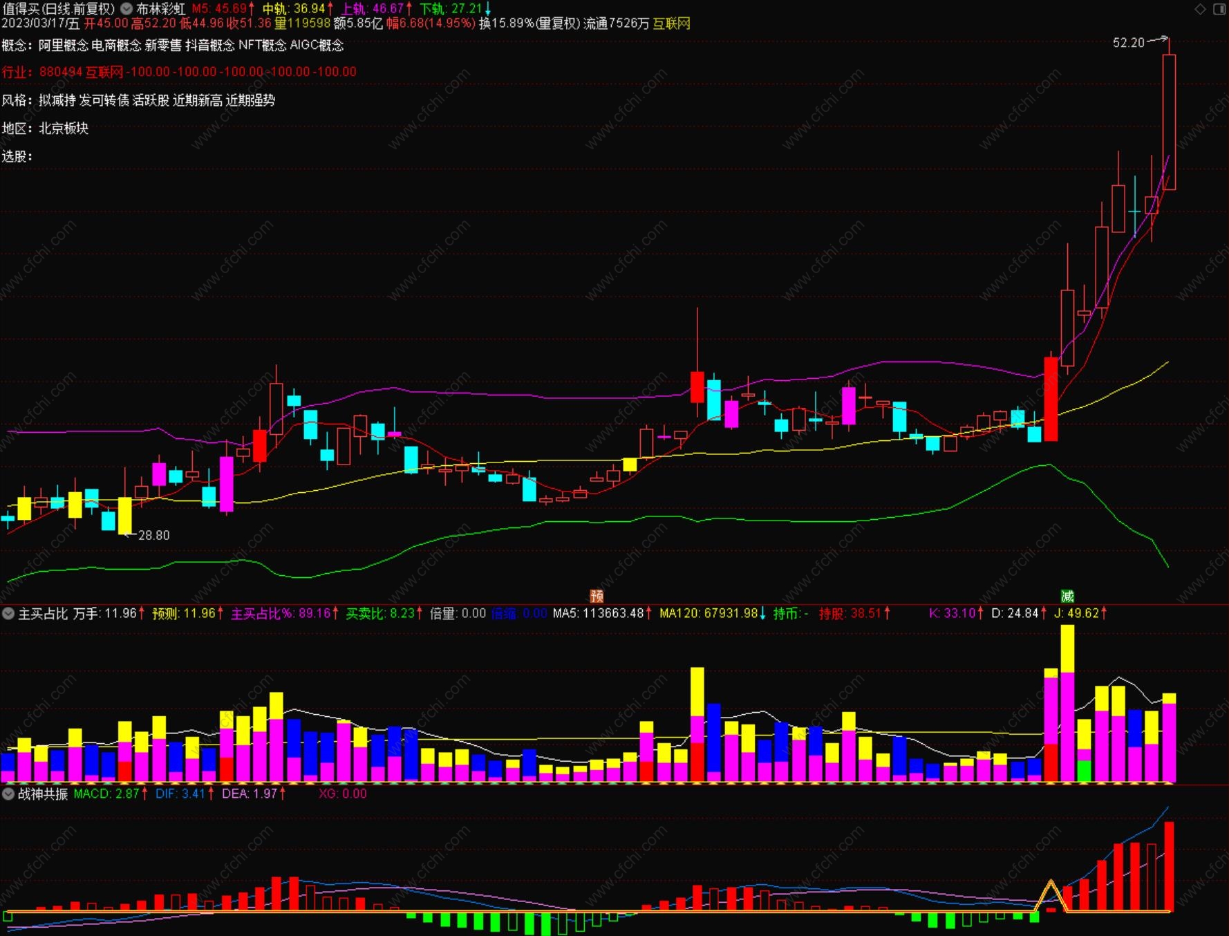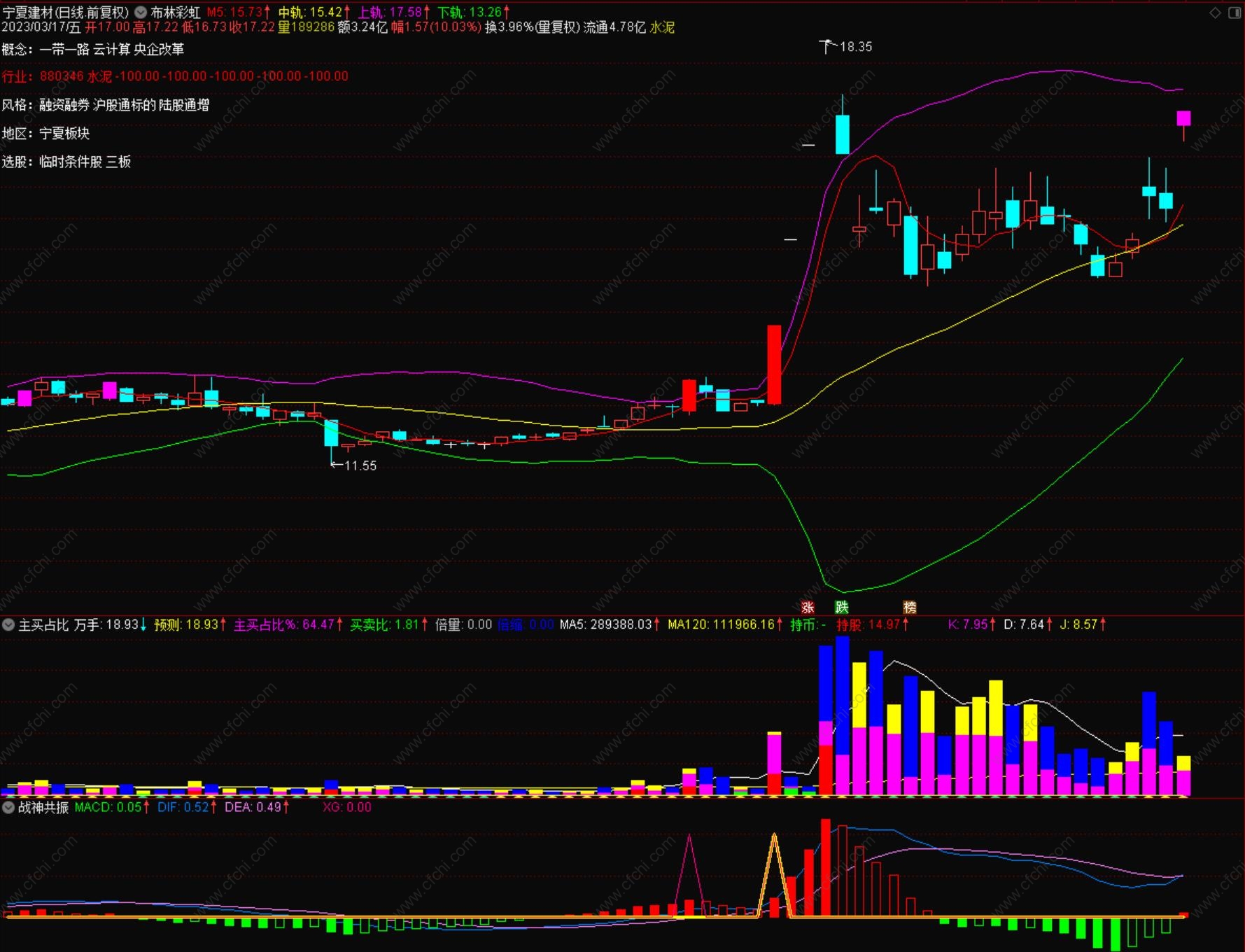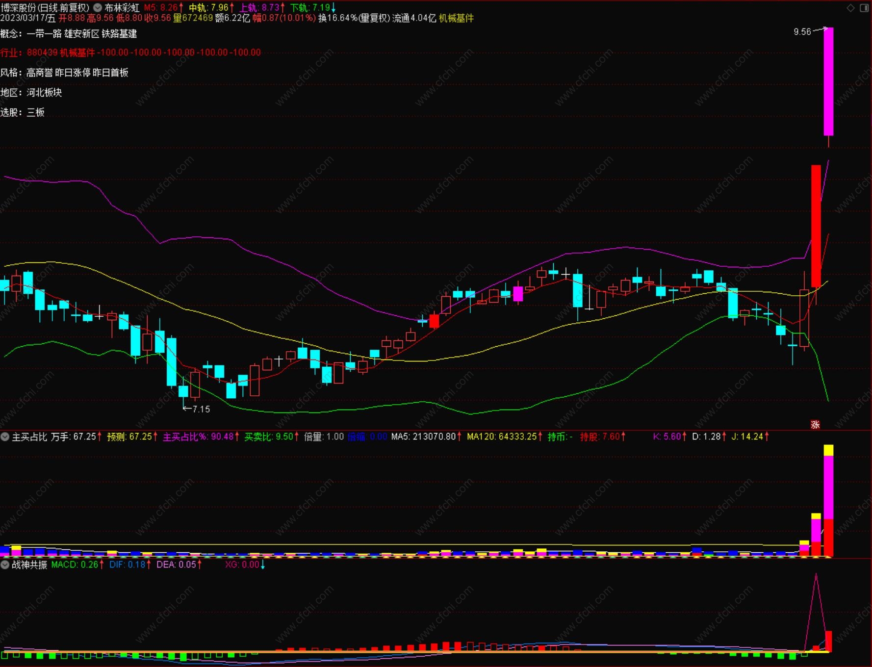 (战神共振副图,最近每天轻松抓牛股的指标公式,有布林彩虹、主买占比、红中红等共振信号)