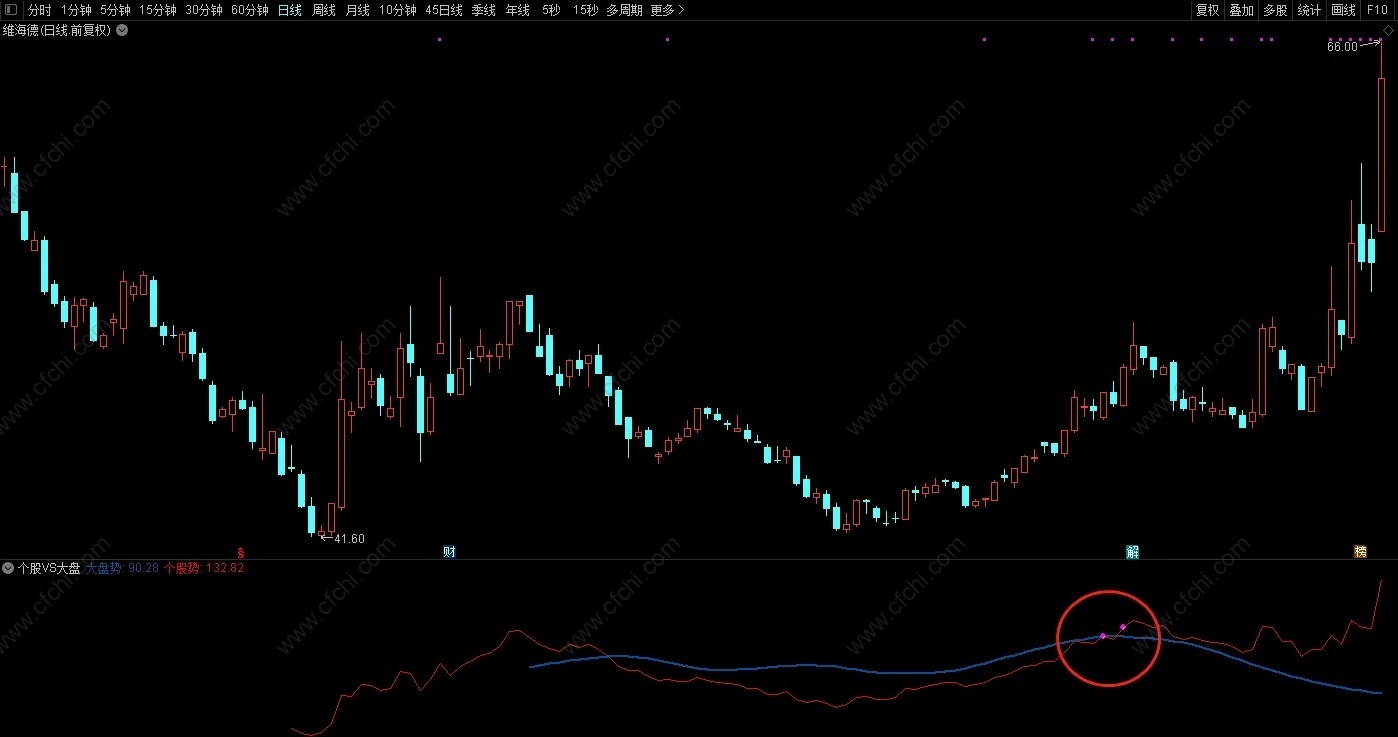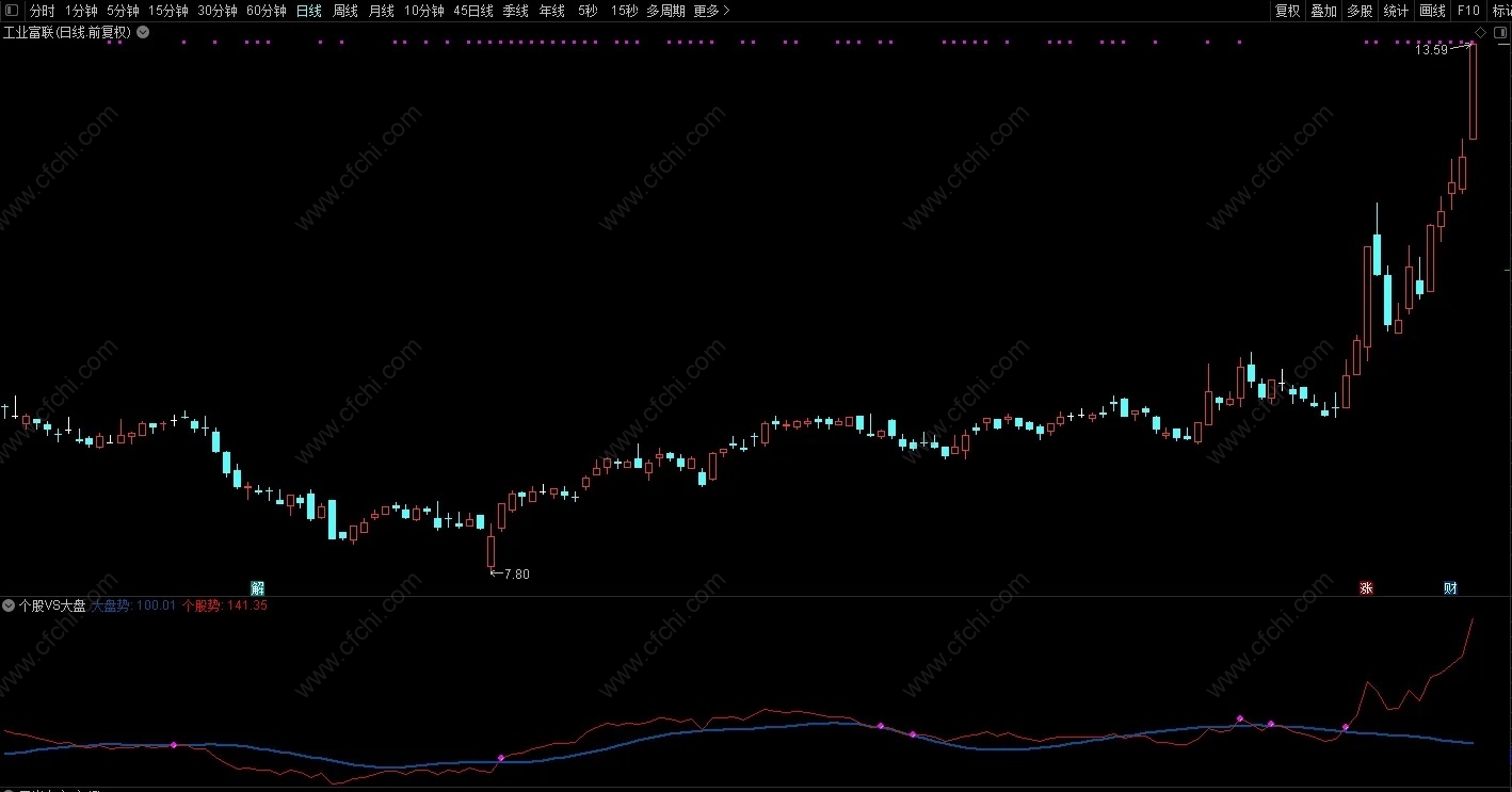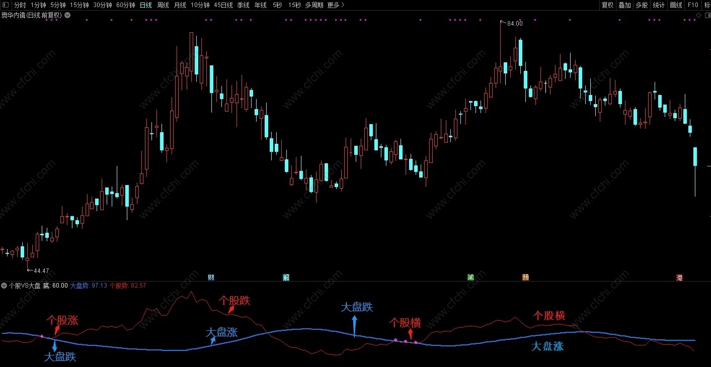 (通达信《个股VS大盘》副图指标,个股线上穿大盘线为短期强,源码分享)