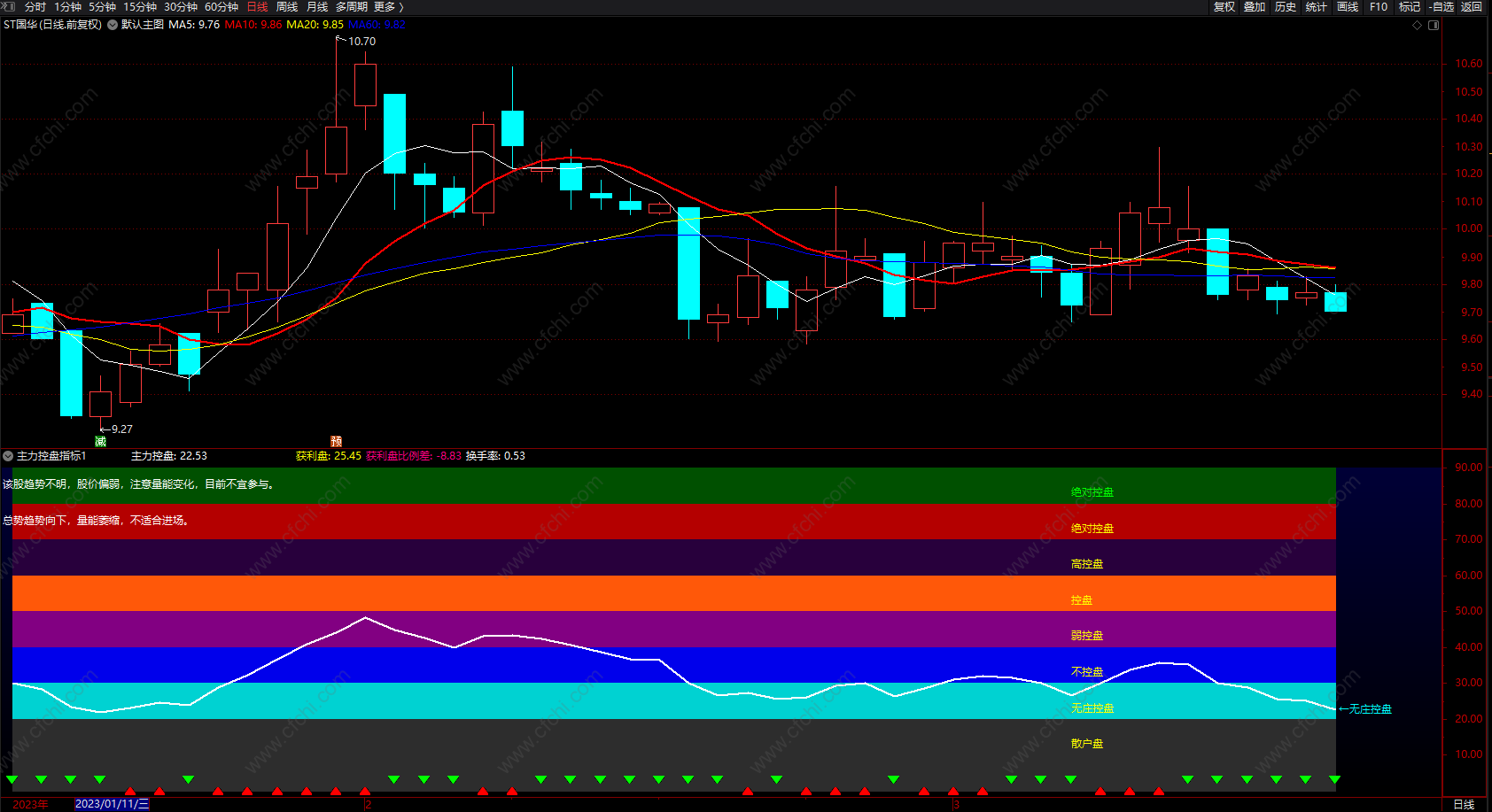 DRAWTEXT_FIX(情况16=1,0,0.03,0,'该股走势太弱,没有参与价值。'),COLORWHITE;