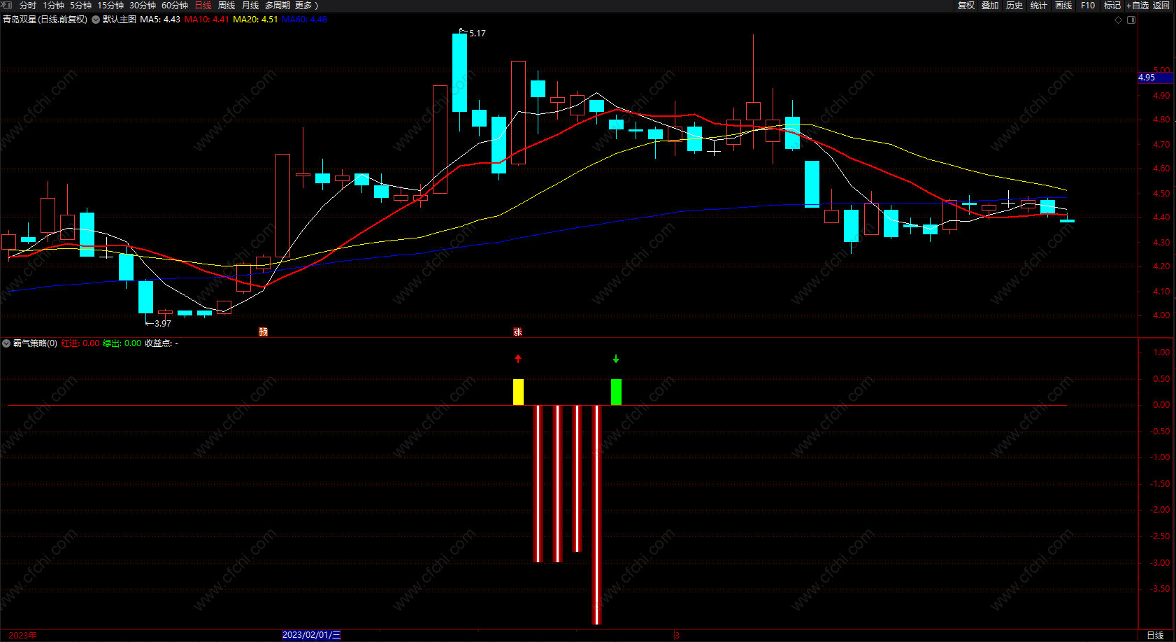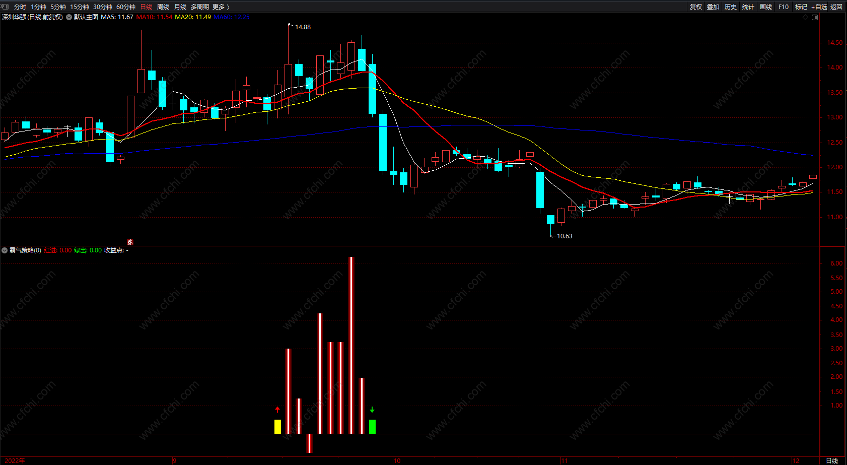 红色箭头介入,绿色箭头卖出,红柱收益提示;