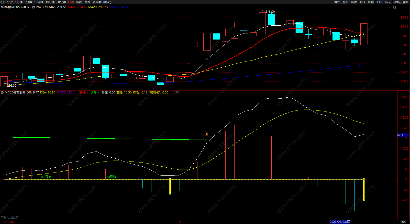 买点:”RSI顶离“黄柱提示上涨,0轴上红色柱上涨;