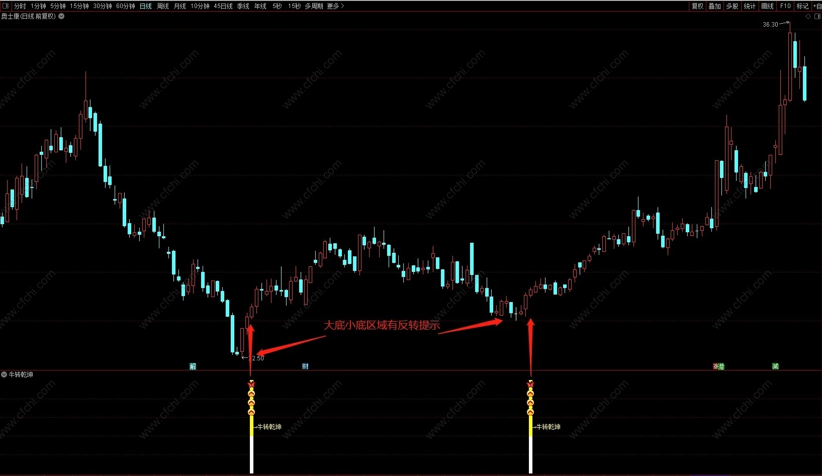 (通达信【牛转乾坤】副图选股指标,大底小底反转信号,源码分享!)